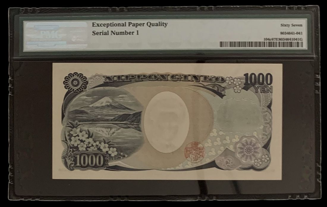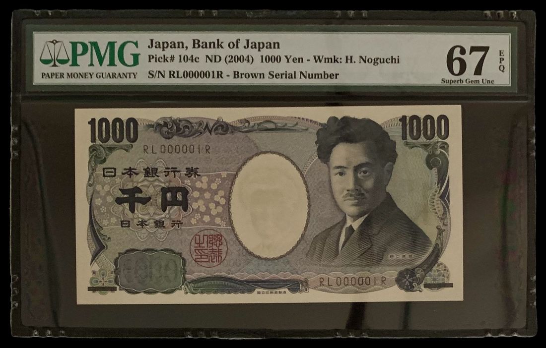 Bank of Japan, 1000 yen, ND (2004), serial number RL000001R, (Pick 104c), PMG 67EPQ