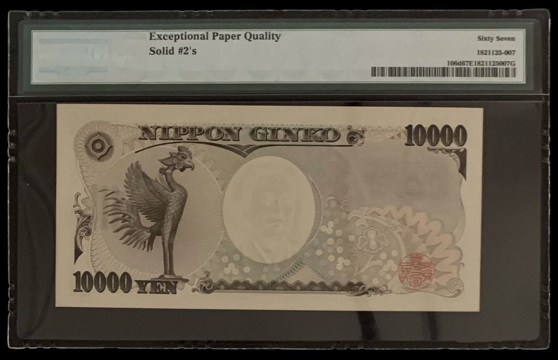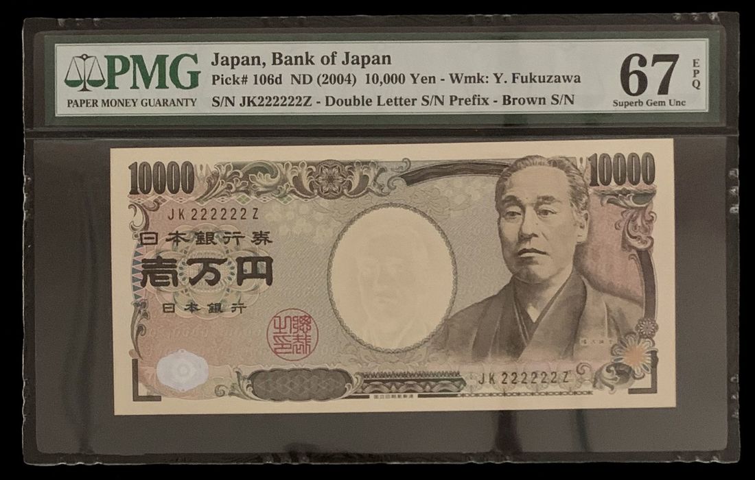 Bank of Japan, 10,000 yen, ND (2004), solid serial number JK222222Z, (Pick 106d), PMG 67EPQ