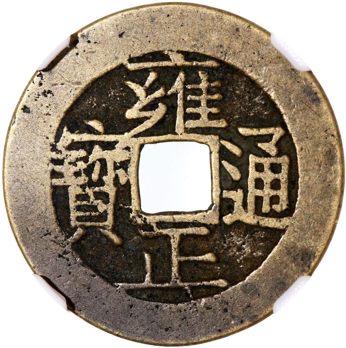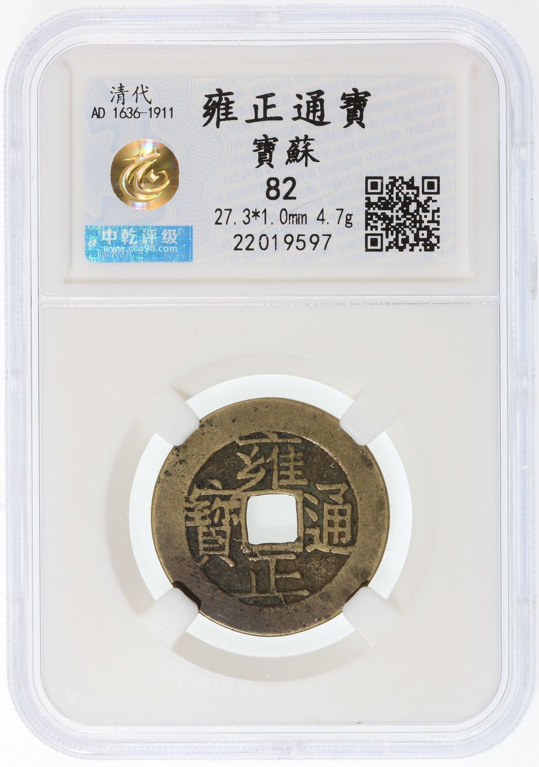 China, Qing Dynasty, [Zhong Qian 82] brass 1 cash, 'Yong Zheng Tong Bao', 1723-1732, Manchurian characters 'Bao Su' (Kiangsu Province mint) on reverse, 27.3x1.0mm, weighs 4.7g