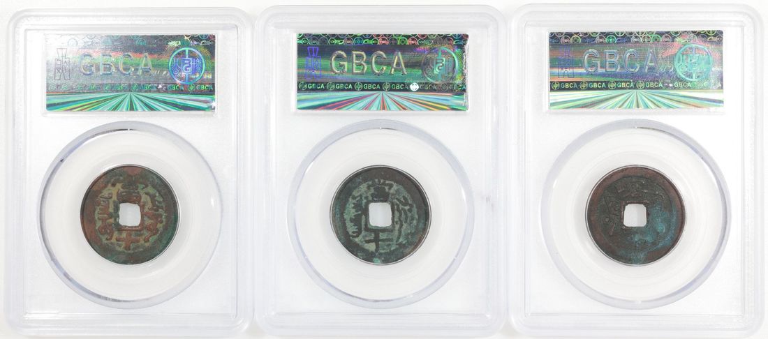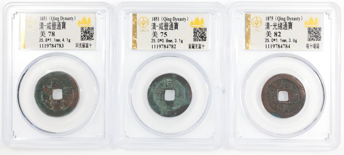 China, Qing Dynasty, a trio of Sinkiang copper 10 cash, including: a pair of 'Xian Feng Tong Bao' from Aksu and Yarkant, 1853-1861 and 1854-1861; 'Guang Xu Tong Bao' from Kashgar, 1888-1908; graded GBCA 78, 75 and 82 (3)