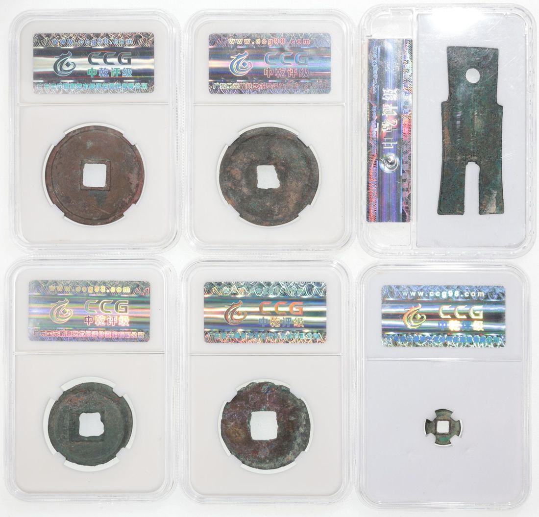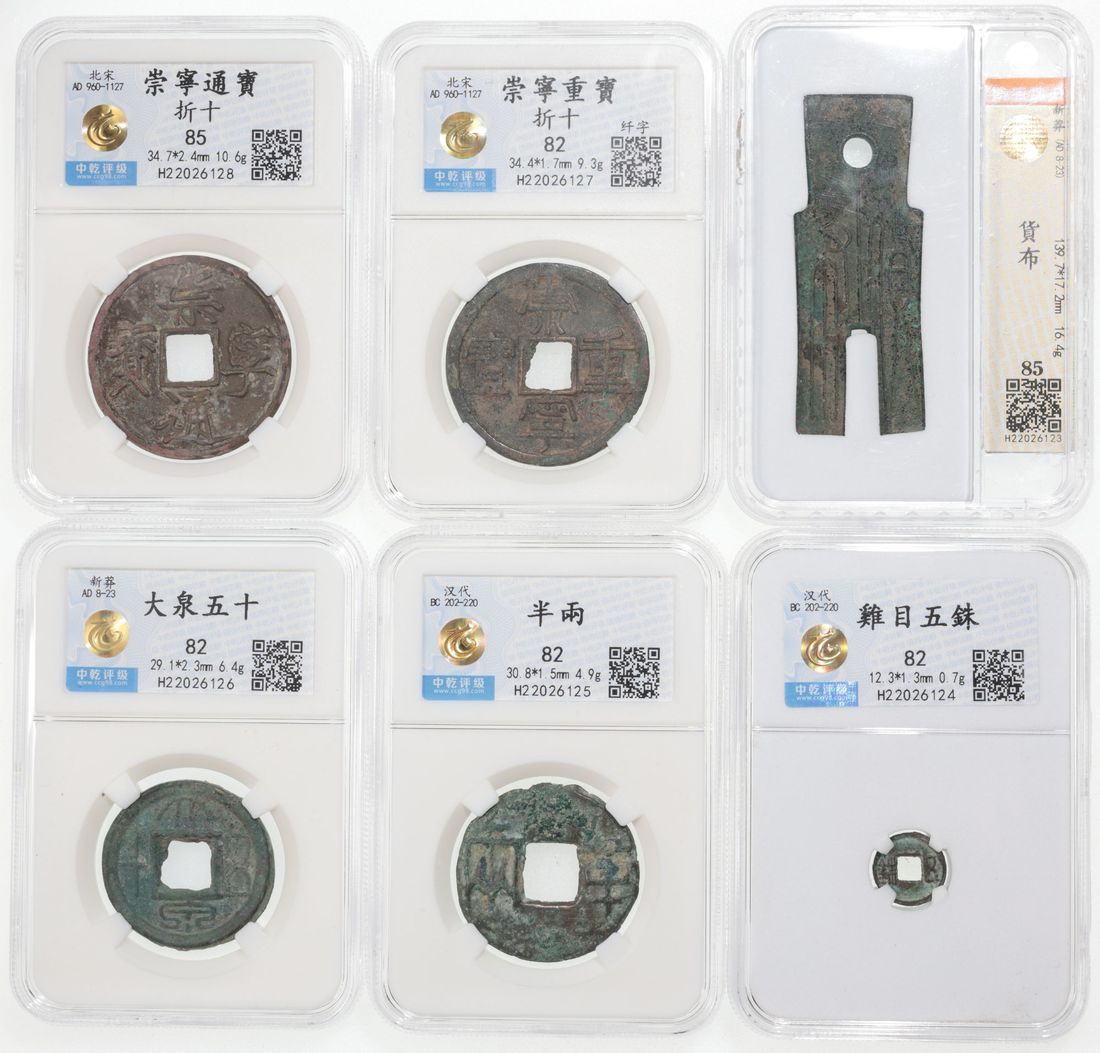 China, a group of 6x bronze cash coins, consisting of Han Dynasty small 'Wu Zhu', 'Ban Liang', Xin Dynasty 'Da Quan Wu Shi', 'Huo Bu' and Song Dynasty 'Chong Ning Zhong Bao' and 'Chong Ning Tong Bao', all Zhongqian graded, mostly 82, the 'Huo Bu' and 'Chong Ning Tong Bao' 85.(6)