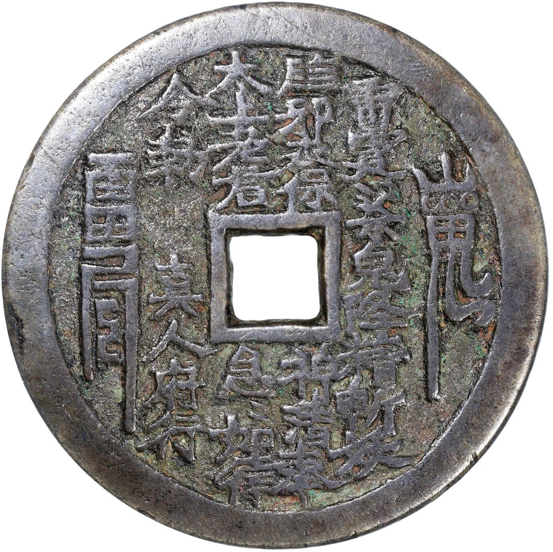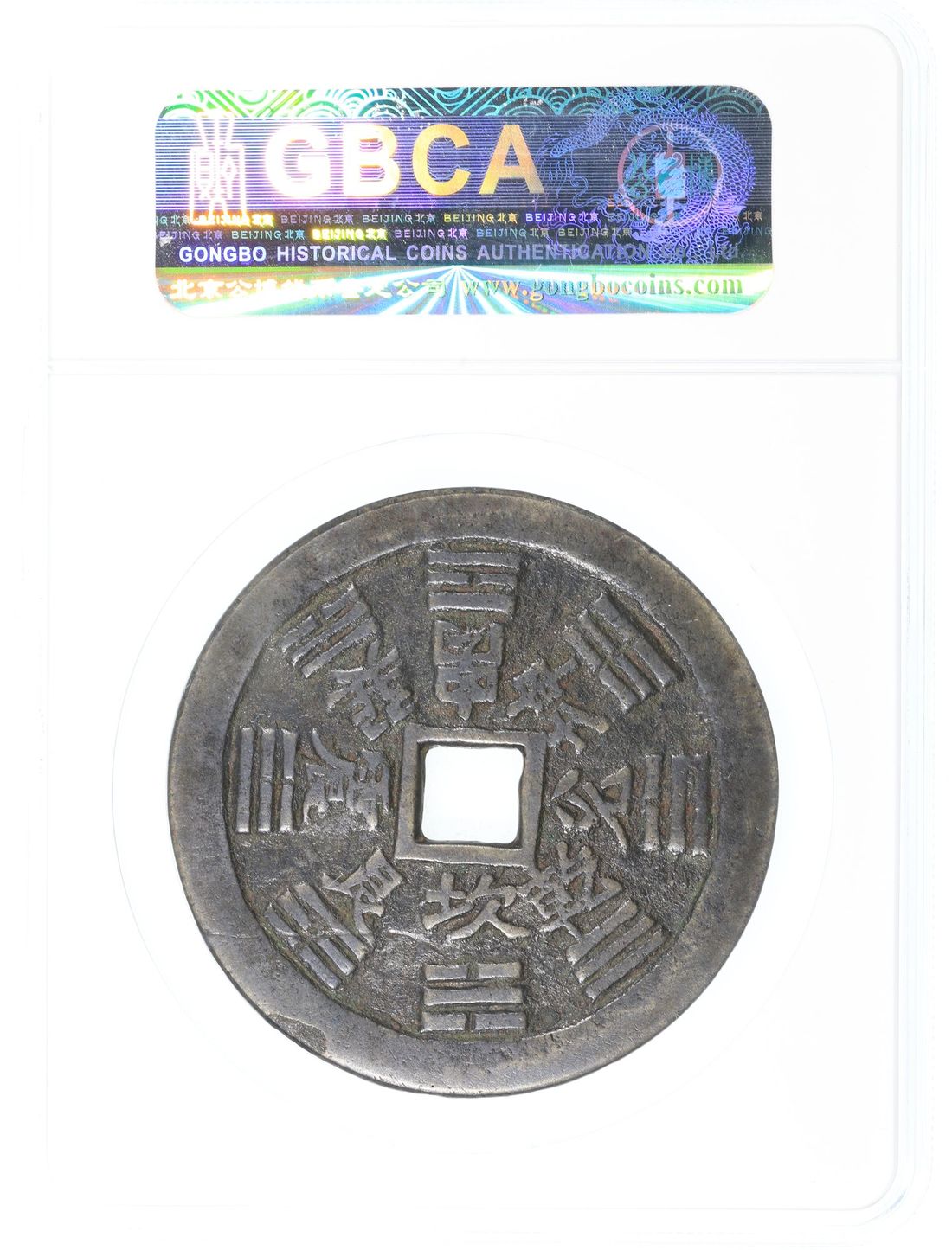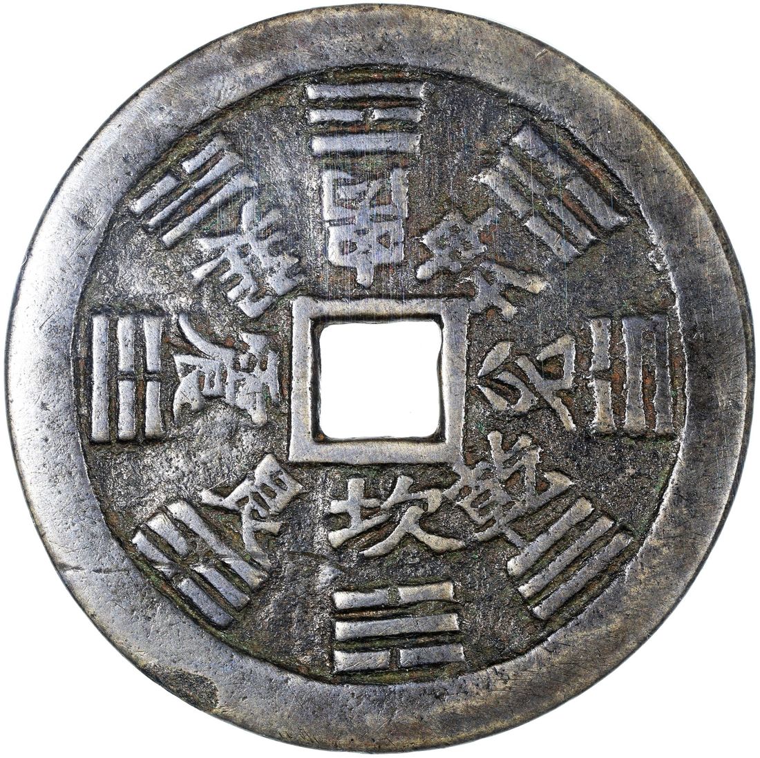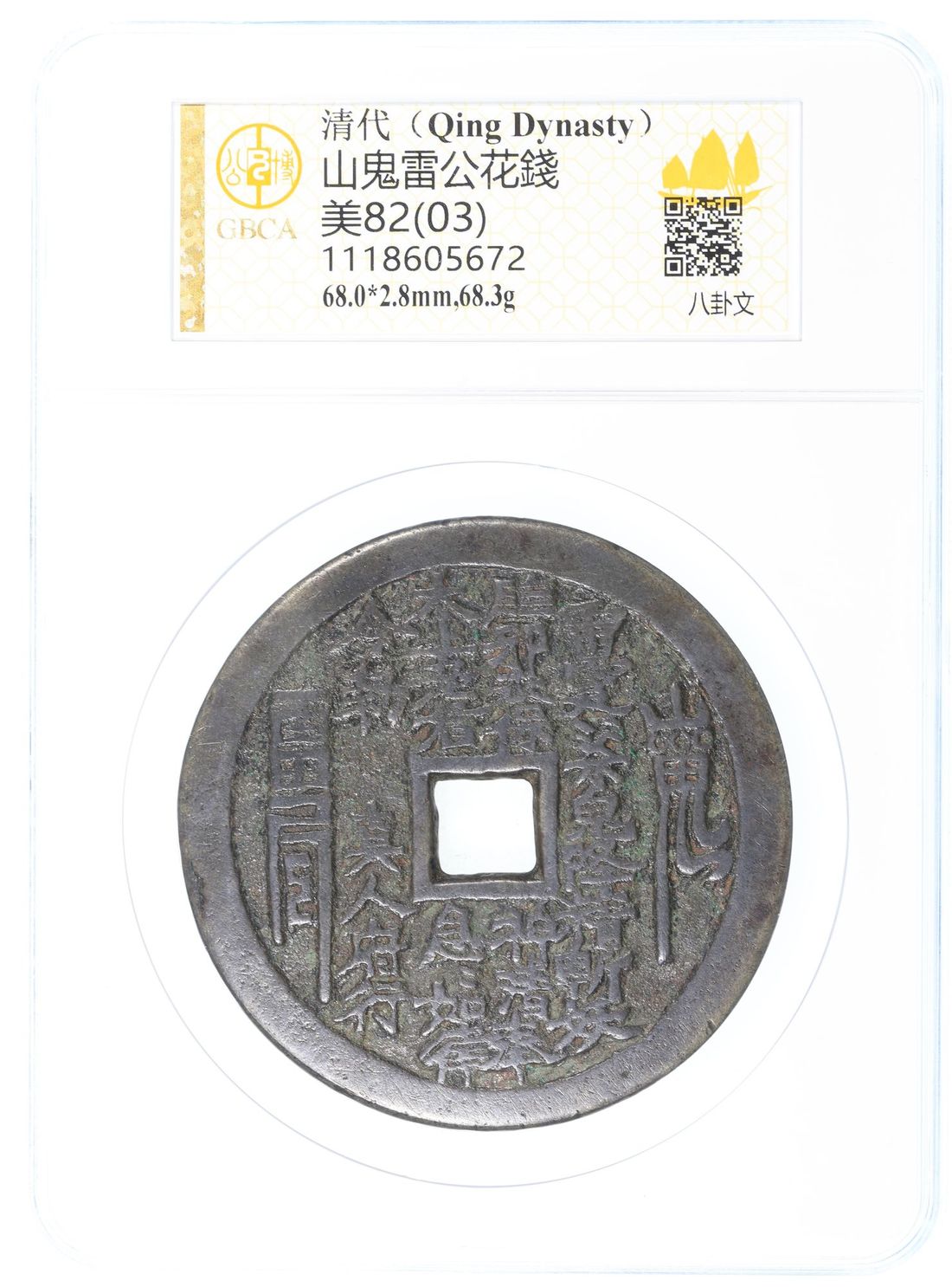 China, Qing Dynasty, [GBCA 82] brass coin-shaped charm with square central hole, 1644-1911, obverse inscribed 'Lei Ting Zhou' (Taoist spell), reverse showing Bagua sign and their corresponding characters, 68.0x2.8mm, weighs 68.3g. Repaired. A red-hot type right now and large size for type, diameter being over 15mm wider than another large type example, which realised a total of 20,400HKD in our CSS112A auction in January 2025 (lot 164). Not to be missed!