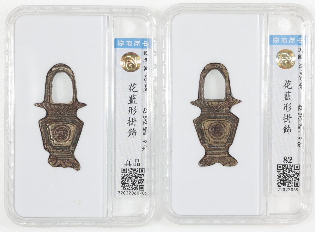 China, Republic, a pair of flower basket shaped hanging ornaments, both in Zhongqian holder, one with damage, thus genuine, the other 82.(2)