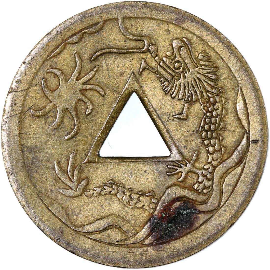 China, Republic, coin-shaped token with triangular central hole, obverse inscribed 'Qian Long Tong Bao' with four trigrams, reverse dragon rising out of the sea, About Extremely Fine. Likely made by Chinese Americans, and rumoured to be a souvenir given out by the San Francisco exhibit in the 1939 New York World's Fair. Interesting