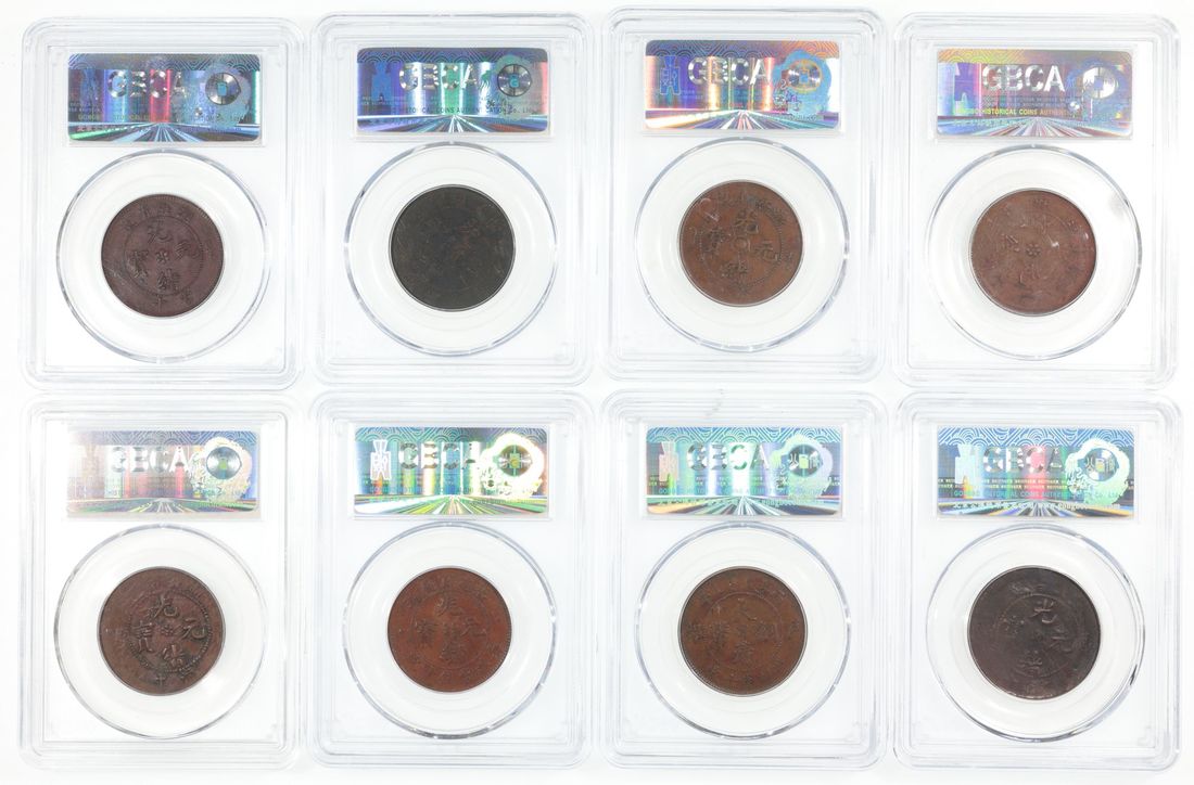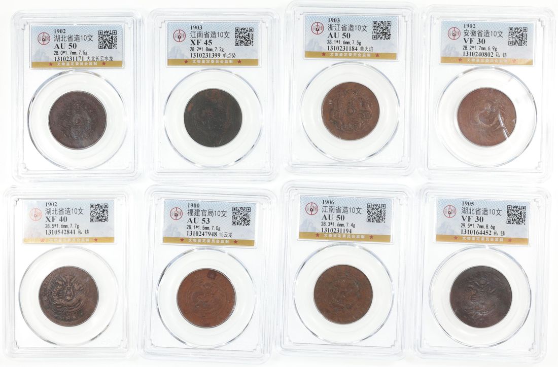 China, Qing Dynasty, a group of 8X copper 10 cash, including: -[GBCA VF30, XF40, AU50] Hupeh Province, 1905 and 1902 private issue, 1902, large 'Bei' variety,