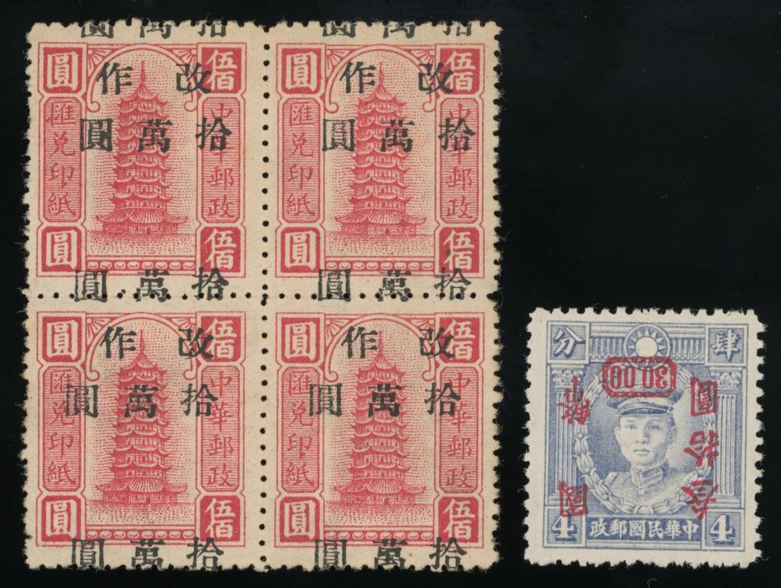 1939-47 small selection of varieties including 1939 Martyrs 2c. block of four with imperf. between, 1944 Paicheng print $5 vertical imperf. between, unused, fine. (5)
