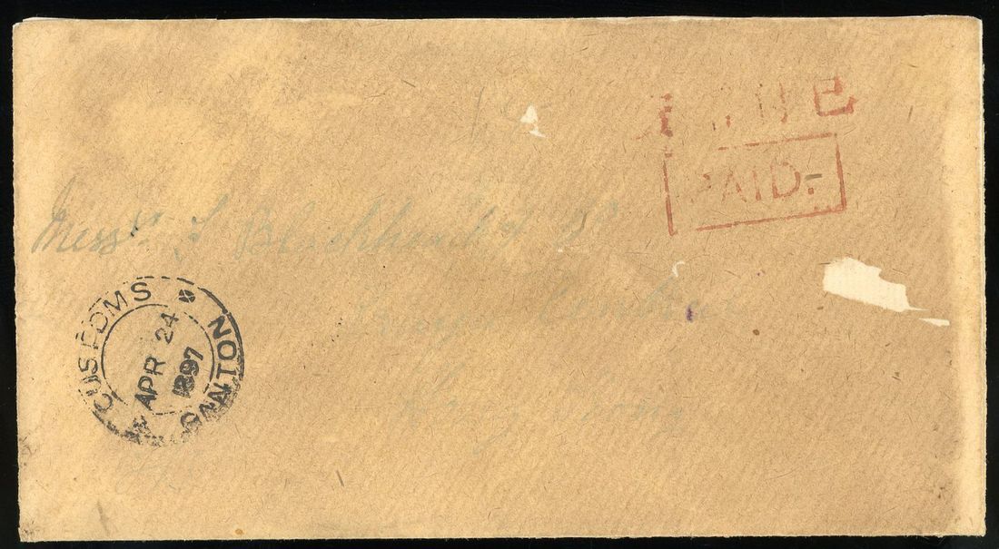 1897 (24Apr) stampless envelope to Hong Kong tied by 'Customs Canton' with boxed 'Paid' in red and with Hong Kong arrival c.d.s. on reverse. Fine.