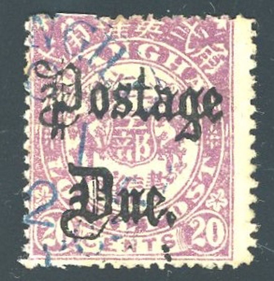 Handstamped on Double Dragons Issue 20c perf. 15 with no watermark variety, used. Rare and unlisted variety. Chan LSD6var.