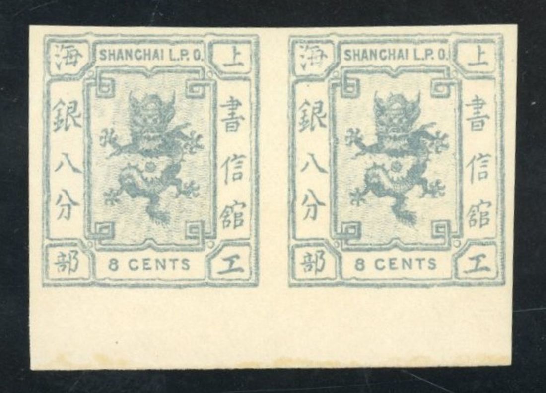 1866 First issue 8c imperforate essay pair with sheet margin, full gum.