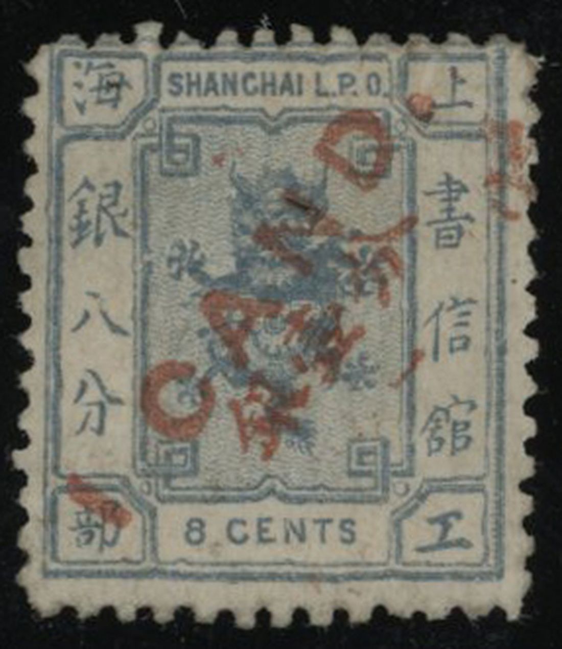 1873 Shanghai Small Dragon Surcharged in red, 1cd on 8c, unbroken "D", mint part original gum hinged, with a small violet chop and pencil marking on reverse, extremely rare. ECL certificate included. Ex Beckeman collection, Zurich Asia November 2006. Chan LS75