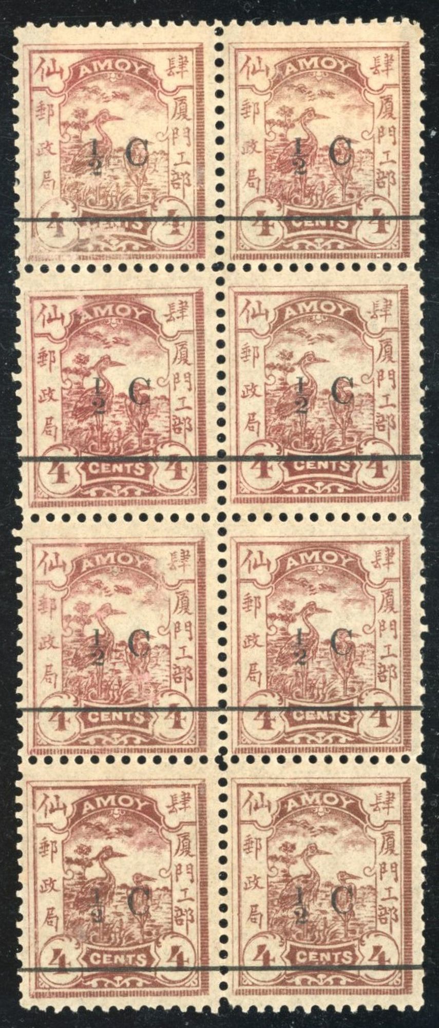 1896 Second Surcharge 1/2c on 4c brown, mint block of 8, fine. Chan LA9