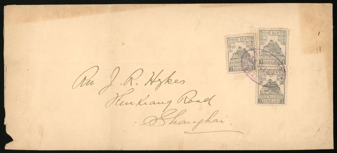 1895 (12 October) cover from Kewkiang to Shanghai bearing Kewkiang 3rd issue 1c x 3, tied by violet oval Kewkiang c.d.s., on reverse faint Shanghai arrival. Photo