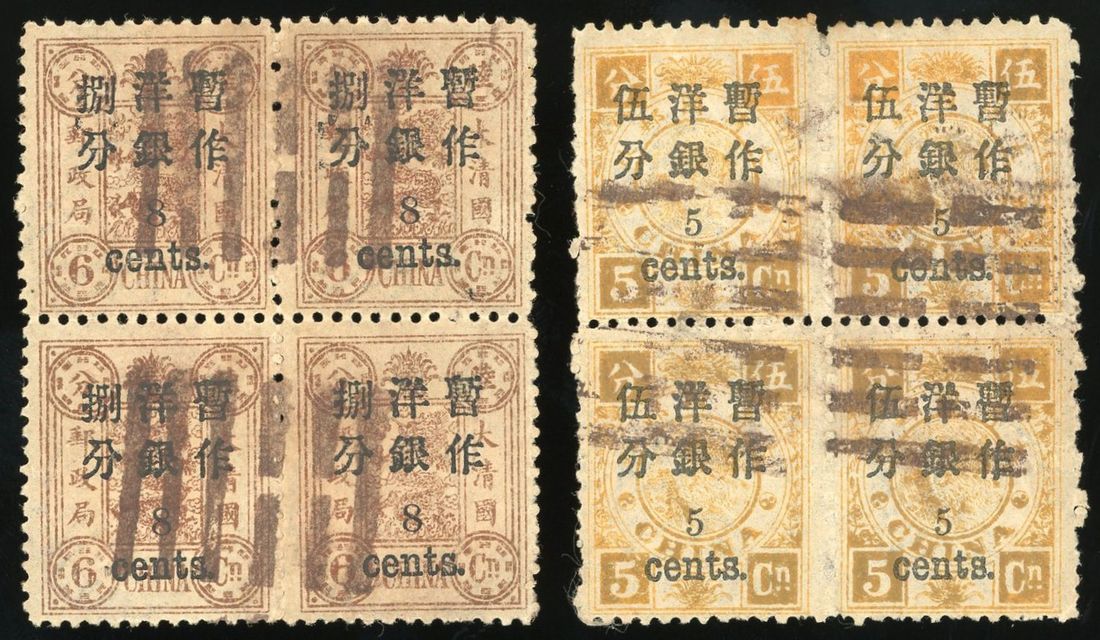 5c. on 5ca. and 8c. on 6ca. blocks of four with pa-kua cancellations.
