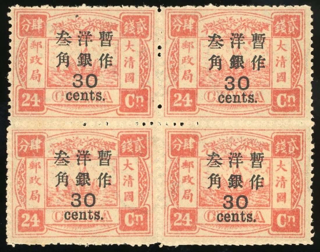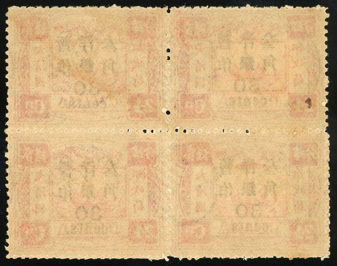 30c. on 24ca. block of four, fabulous mint full original gum never hinged, a few rough perforations at top and bottom. Two perforations with toning at bottom left corner and a small mark at back. Extremely fine for a great rarity of which only two blocks of four are recorded. Chan 73.