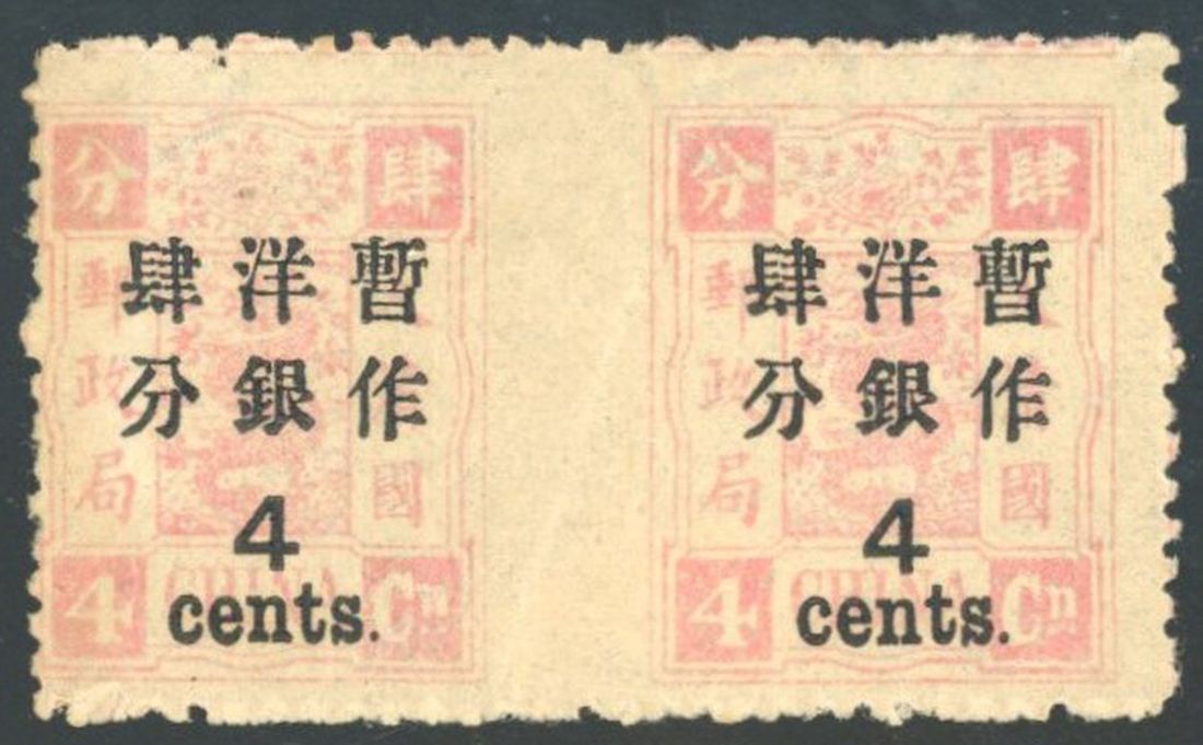 4c on 4c horizontal pair with interpanneau margin imperforate between, mint large part original gum. Rare only 6 pairs recorded. Ex Dr James K Senior. Chan 59f.
