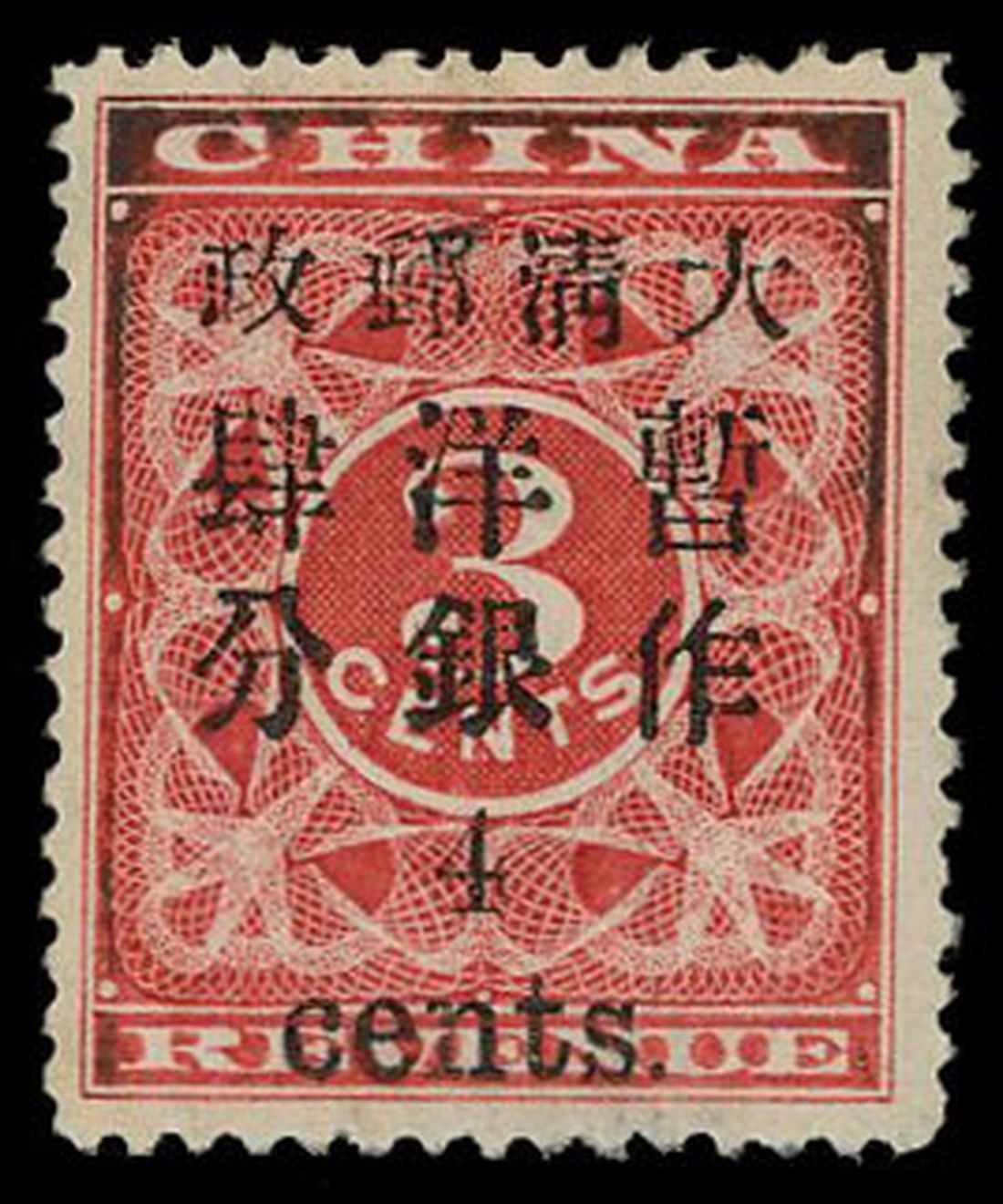 1897 Red Revenue small 4 cents surcharge, mint regummed with minor oxidization, fresh colour. Chan 85. Photo