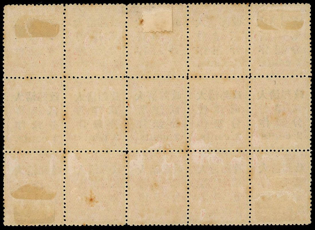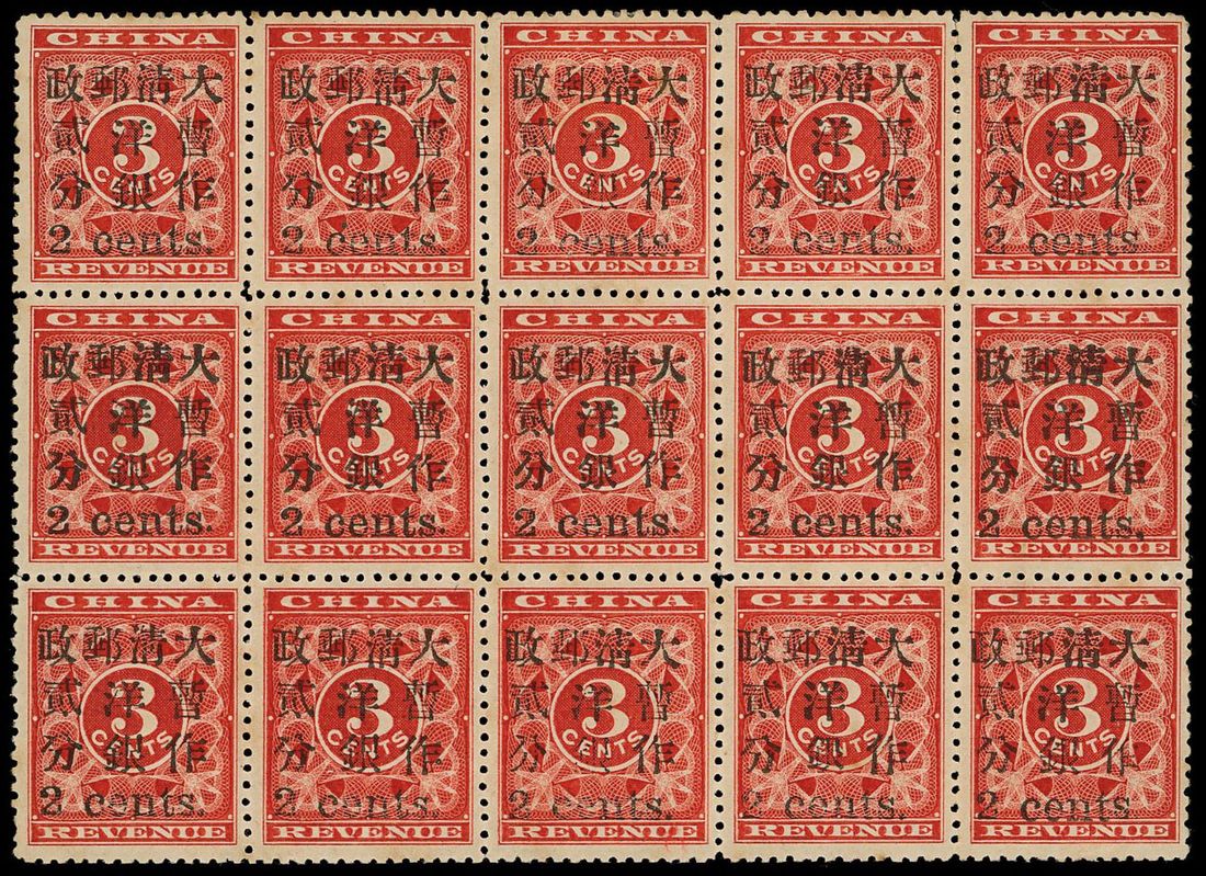 1897 Red Revenue small figures surcharge 2cts on 3cts block of 15, mint with original gum, tone spots and hinges in each corner. Includes inverted "s" (2) and comma after "s" varieties. Scarce multiple. Chan 84, e, g. Photo