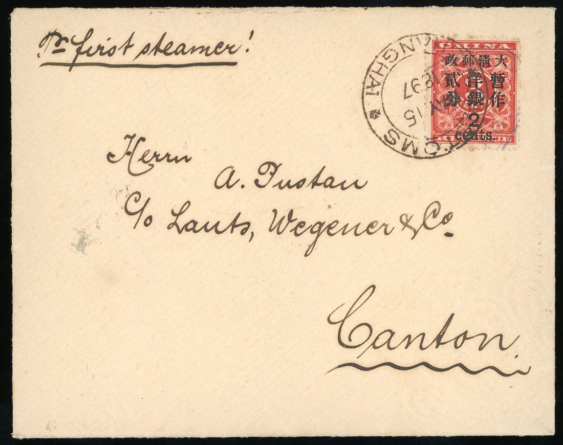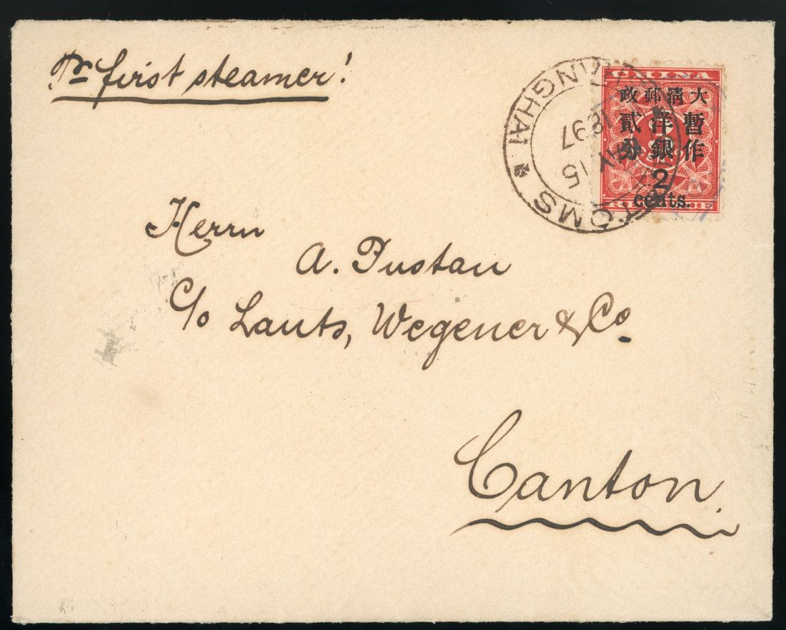 1897 (15 May) cover from Shanghai to Canton bearing large 2c. tied by Shanghai customs cds, on reverse Cantion Imperial Post Office cds (22 May). Fine with minor toning.