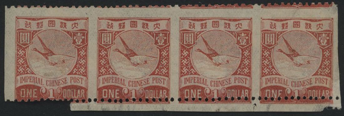$1 flying geese horizontal strip of four imperforate between, mint full original gum hinged on one stamp. Rare. Chan 101c.