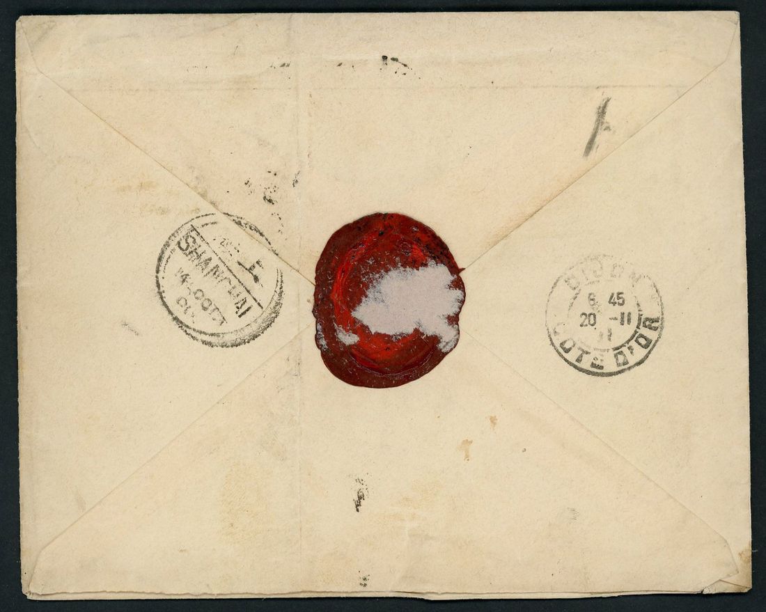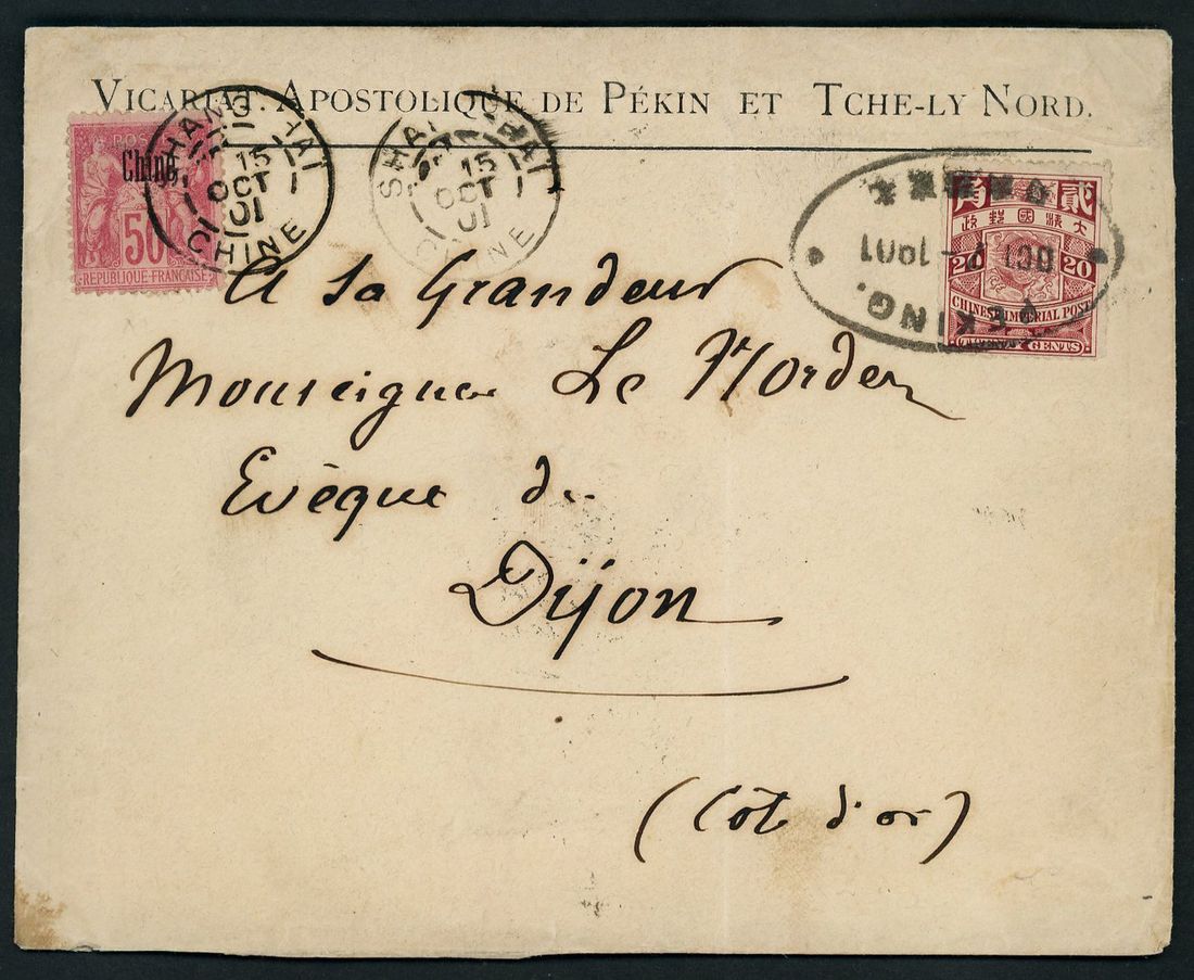 1901 (7 Oct) cover from Peking to France bearing CIP 20c cancelled by oval Peking date stamp routed via Shanghai bearing French China 50c tied by French Post Office 'Shanghai-Chine' double ring with arrival on reverse.Very fine and rare comination.