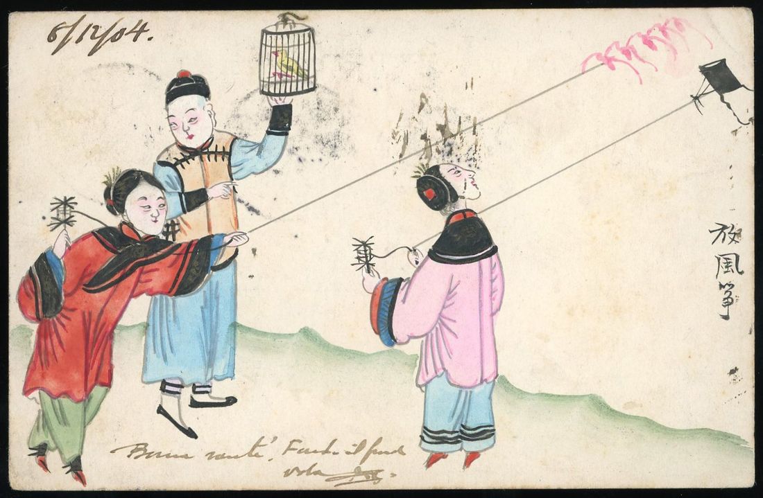 1905 (Jan.) a registered postcard from Tientsin to Belgium, mailed via the German Post Office (with lost stamps). Hand-painted Chinese lady flying a kite on the reverse.