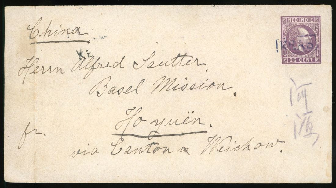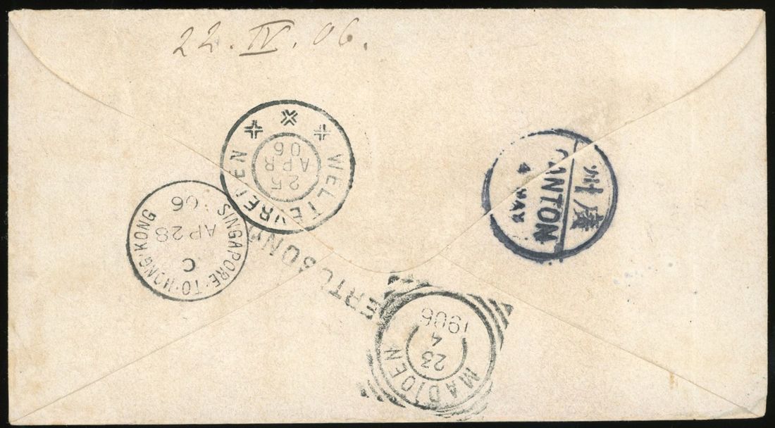1906 (22 Apr) Netherlands Indies postal stationery envelope 25c cancelled by framed 'KRAS' addressed to Hoyuen,China. Endorsed 'via Canton and Weichow' with Madioen '23 Apr' and 'Weldtevreden 25 Apr' on reverse, then by maritime mail from Singapore to Hong Kong dated 'AP28' and 'Canton 4 May'. Very nice item of incoming mail.