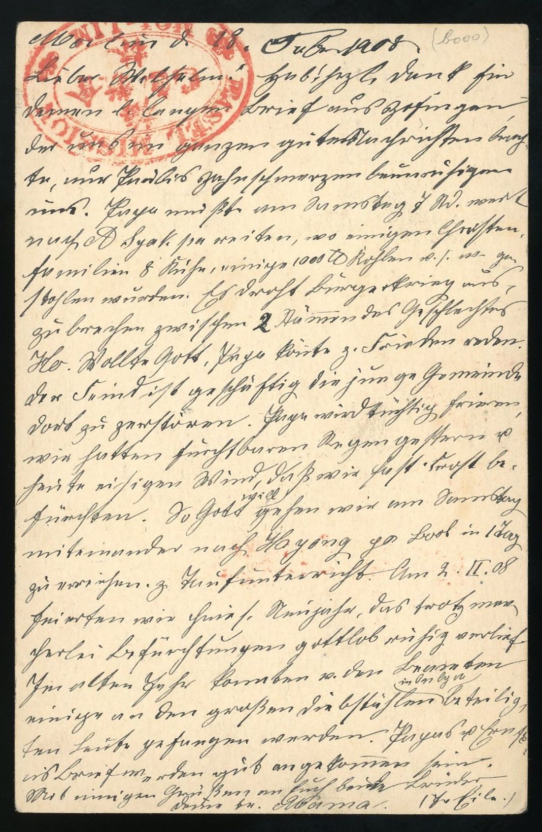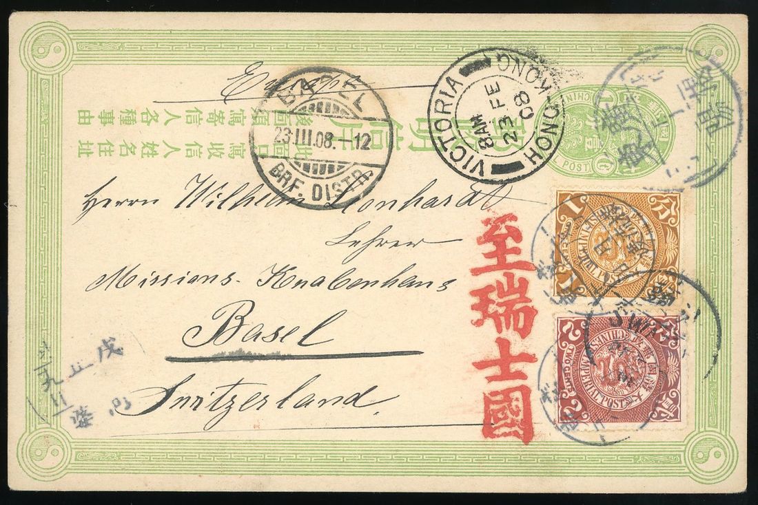 1908 (19 Feb.) The third issue Coiling Dragon Ic. card from Wongliutu, Canton to Basel Switzerland. uprated C.I.P.1c. and 2c. tied by good strikes of Wongliutu c.d.s., with Hopo (20.2), Kityang (21.2), Swatow (21.2) c.d.s., and transit from Hong Kong (23.2) to Switzerland., arrived Basel on 23 march. on the reverse side bears a red oval hand stamp of "Merlin Basel mission." The postal route is clear. It's in fair to good condition. A rare postal card from a small town in Canton province used to send international mail.
