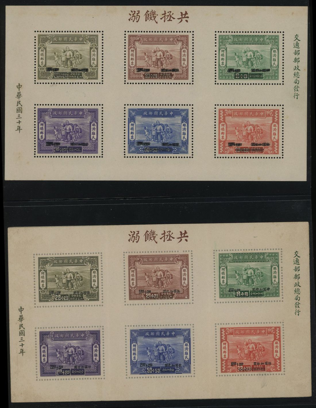 1944 War Refugees Relief Fund Issue miniature sheet with double surcharge variety plus normal for comparaison. Chan MS2b.