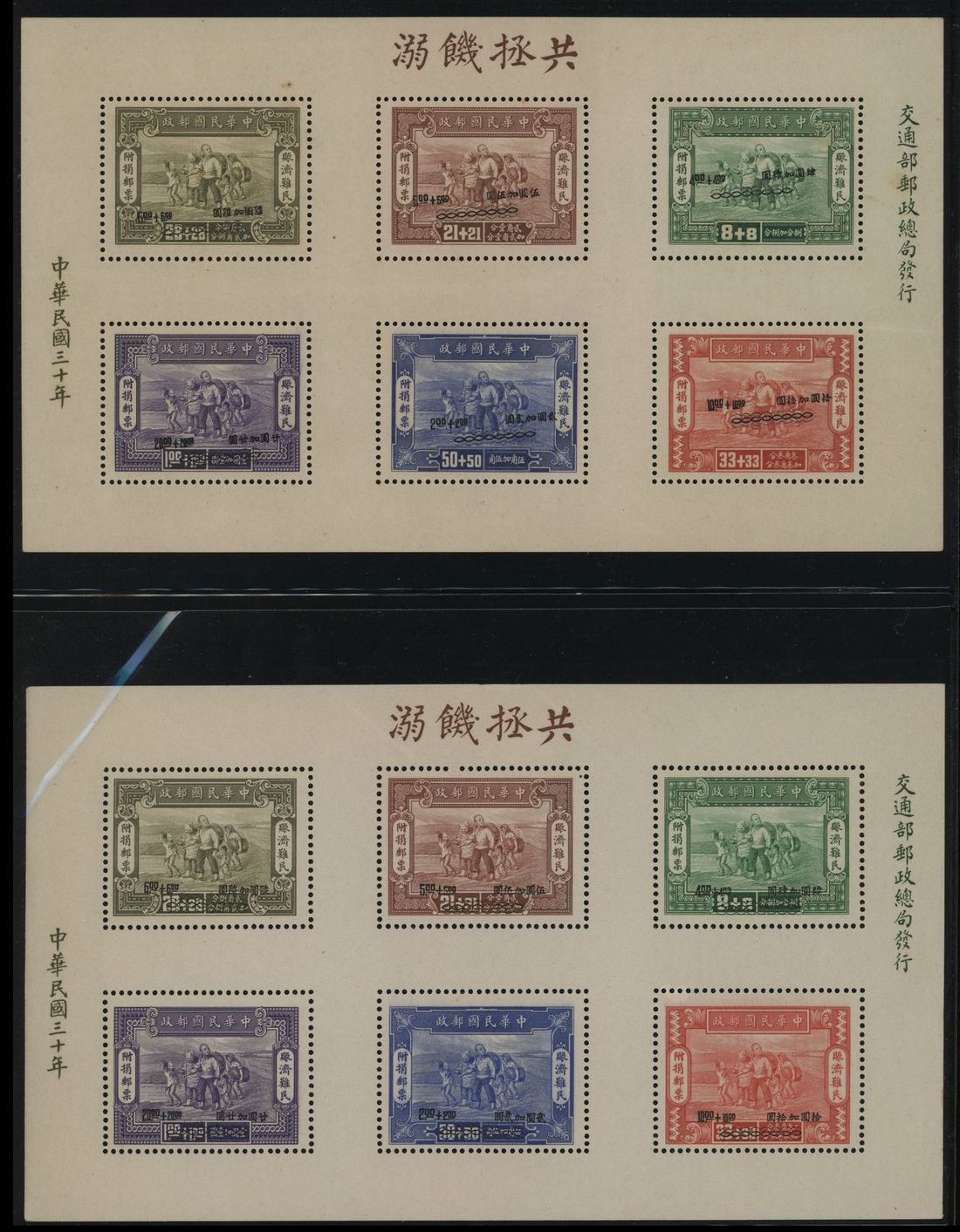 1944 War Refugees Relief Fund issue miniature sheet with surcharge misplaced variety plus normal for comparaison. Extremely rare. Chan MS2c.