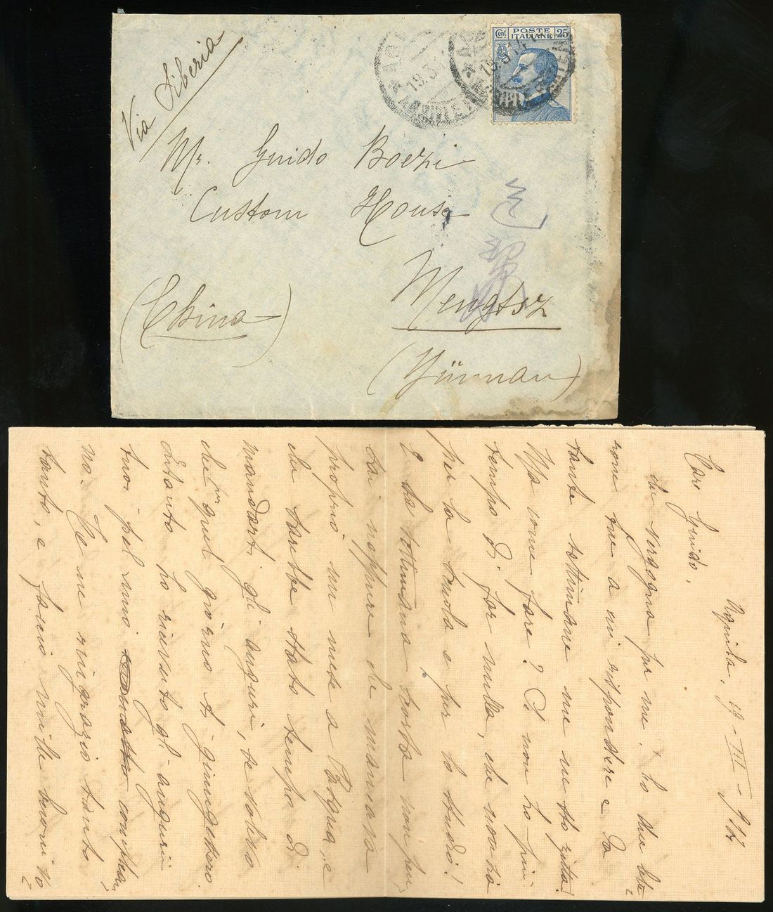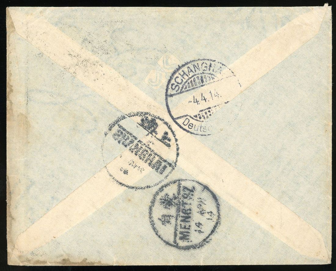 1914 (19 Mar) envelope to Mengtsz written from Italy bearing 25c tied by '19 Mar 14' c.d.s. and routed via 'Schanghai Deutsche Post 4.4.14' and 'Shanghai' c.d.s.arrival 'Mengtsz 14 Apr 14'on reverse.Fine.