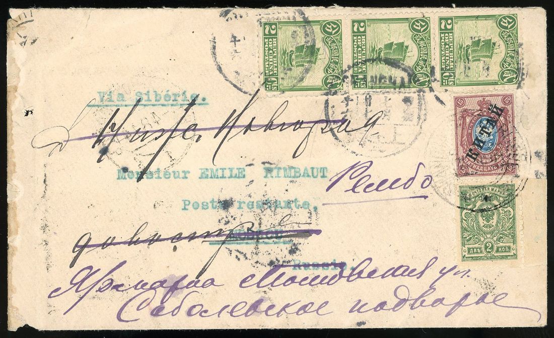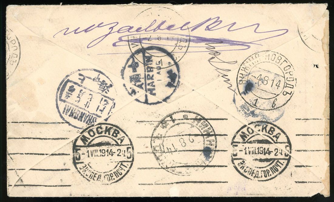 1914 (27 Jul) envelope to Russia bearing Junk 2c x3 and mixed with Russian Post Office in China 2k and 15k tied by Shanghai c.d.s. and 'Shanghai Poste Russie'. Cancelled 'Shanghai 27 Jul' and routed via 'Harbin 1 Aug' and Mockba and arrival "Norgorod' dated '4 Aug.14' clear postmark on reverse.Fine.