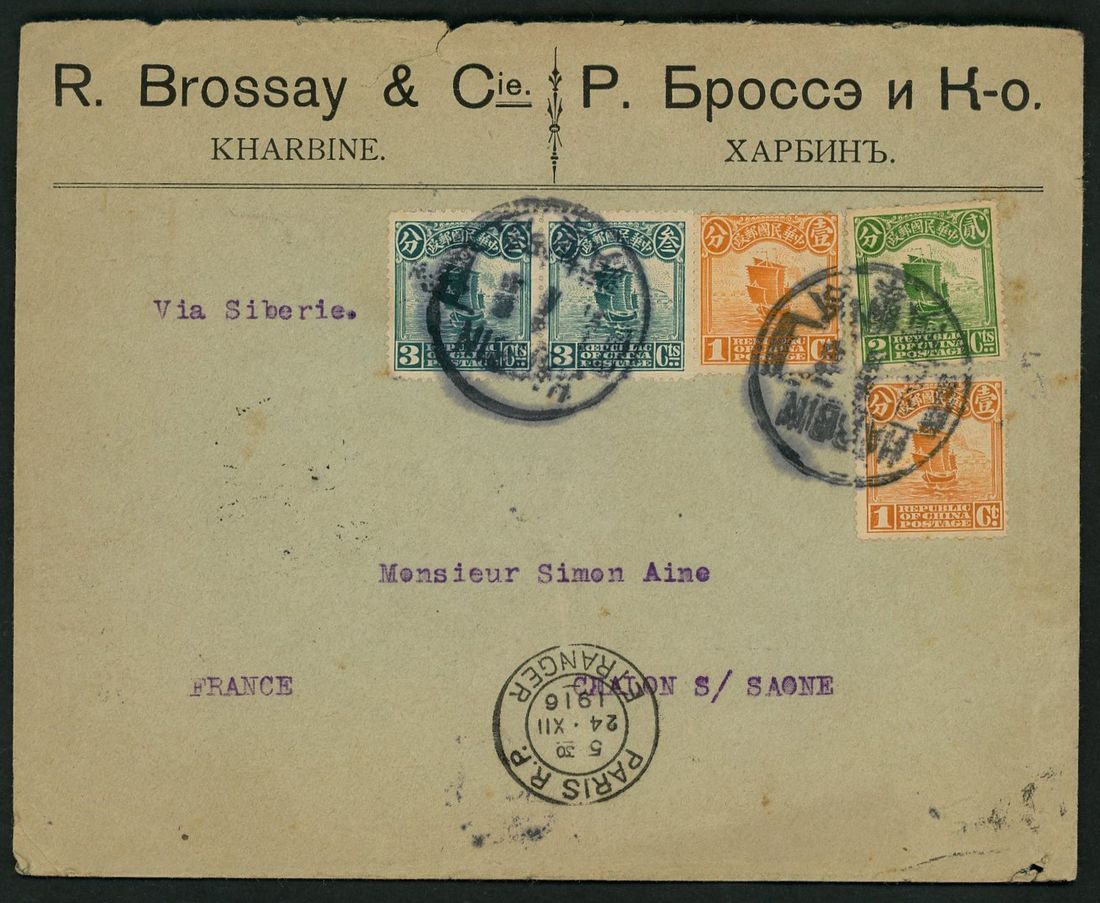 1916 envelope to France bearing Junk 1c x2, 2c and 3c x2 tied by Harbin c.d.s. endorsed 'Via Siberia' with Loire arrival '25 Dec 16'. Attractive franking.