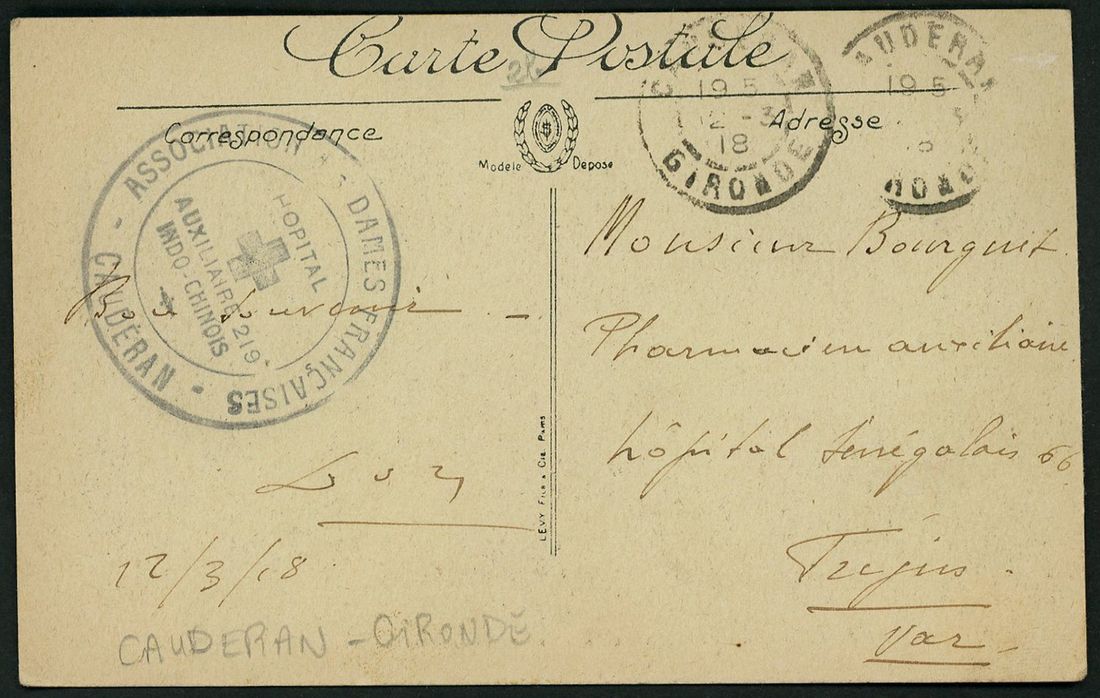 1918 (Chinese Labour Force) Picture Postcard to Var, cancelled by Cauderan/ Gironde date stamp with circular " Association des Dames Francaise/ Cauderan/opital/ Auxiliiaire 219/ Indo_Chine"' very fine.