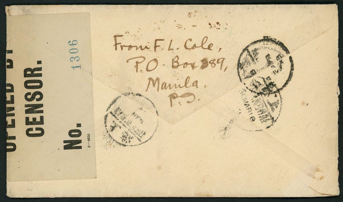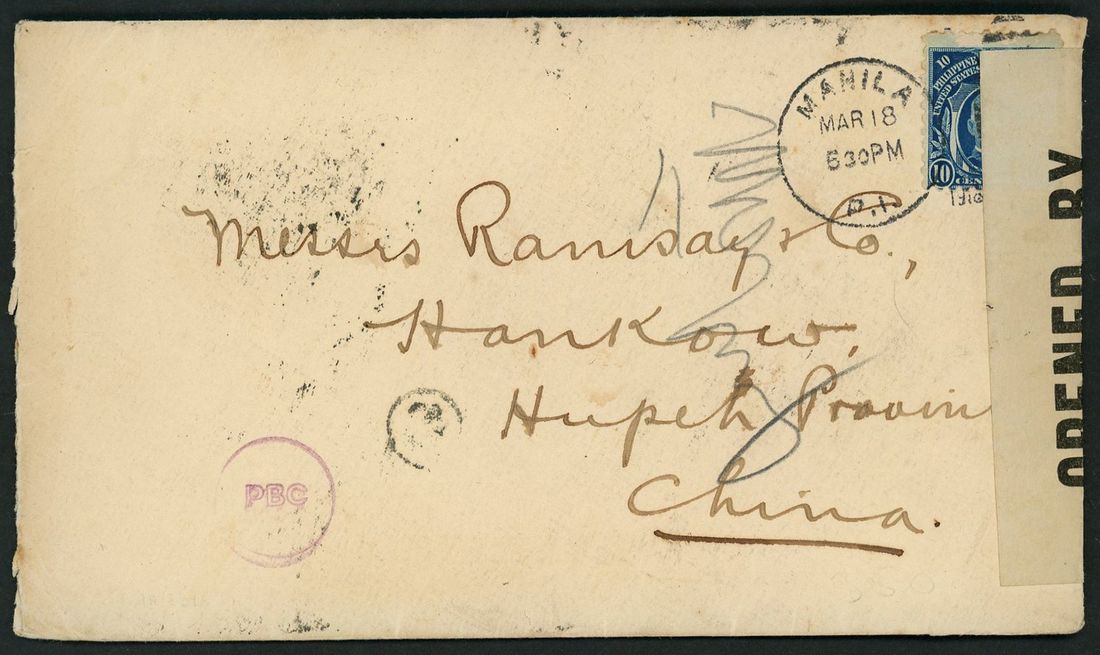 1918 envelope to Hankow Hupeh Province China bearing Philippines 10c tied by Manila duplex routed via Hong Kong with 'Opened by Censor No.1306' label and circular 'PBC' in violet on face with Shanghai transist and Hankow arrival. Scarce item of censored mail.