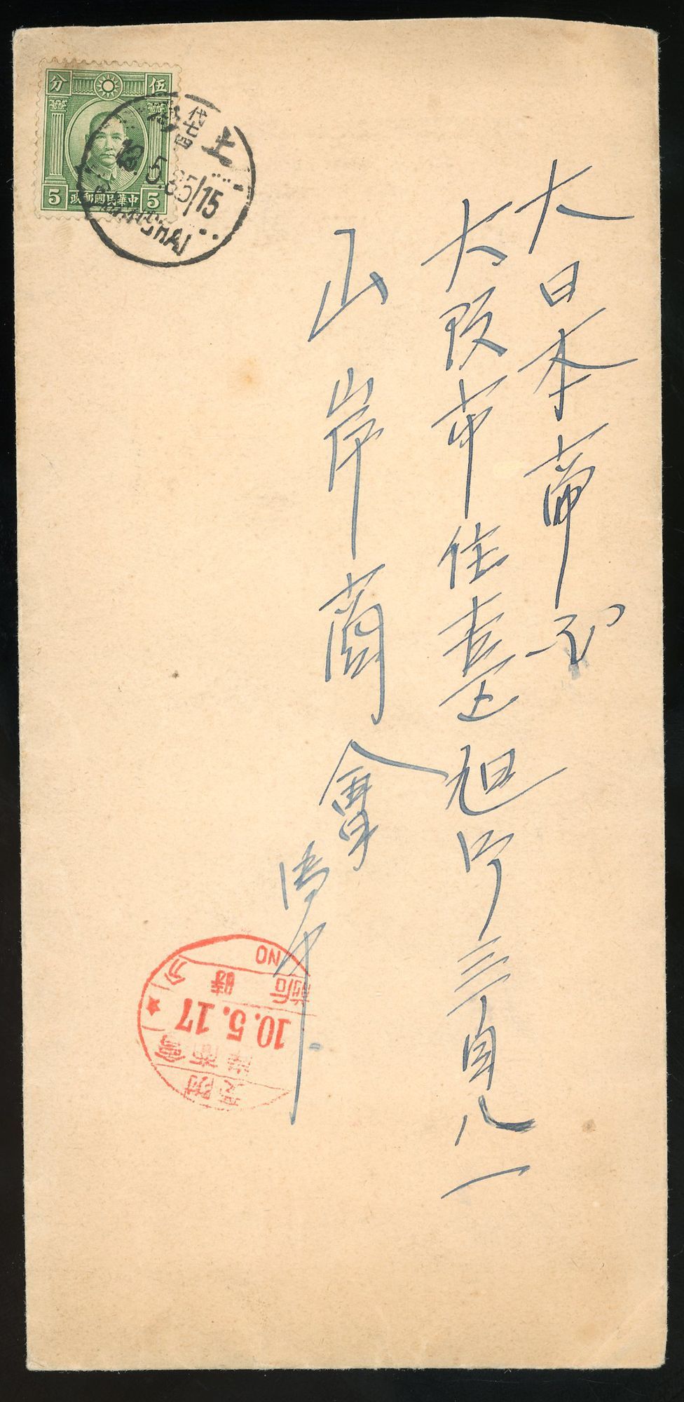 1935 (13 May) envelope to Japan bearing 5c tied by Shanghai c.d.s. and cancelled by company chop in red with arrival dated 17.5 10. Fine.