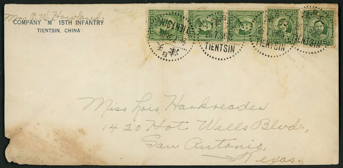 1936 (26 Jul) envelope to Texas bearing 5c x5 tied by 'TienTsin' c.d.s. Fine.