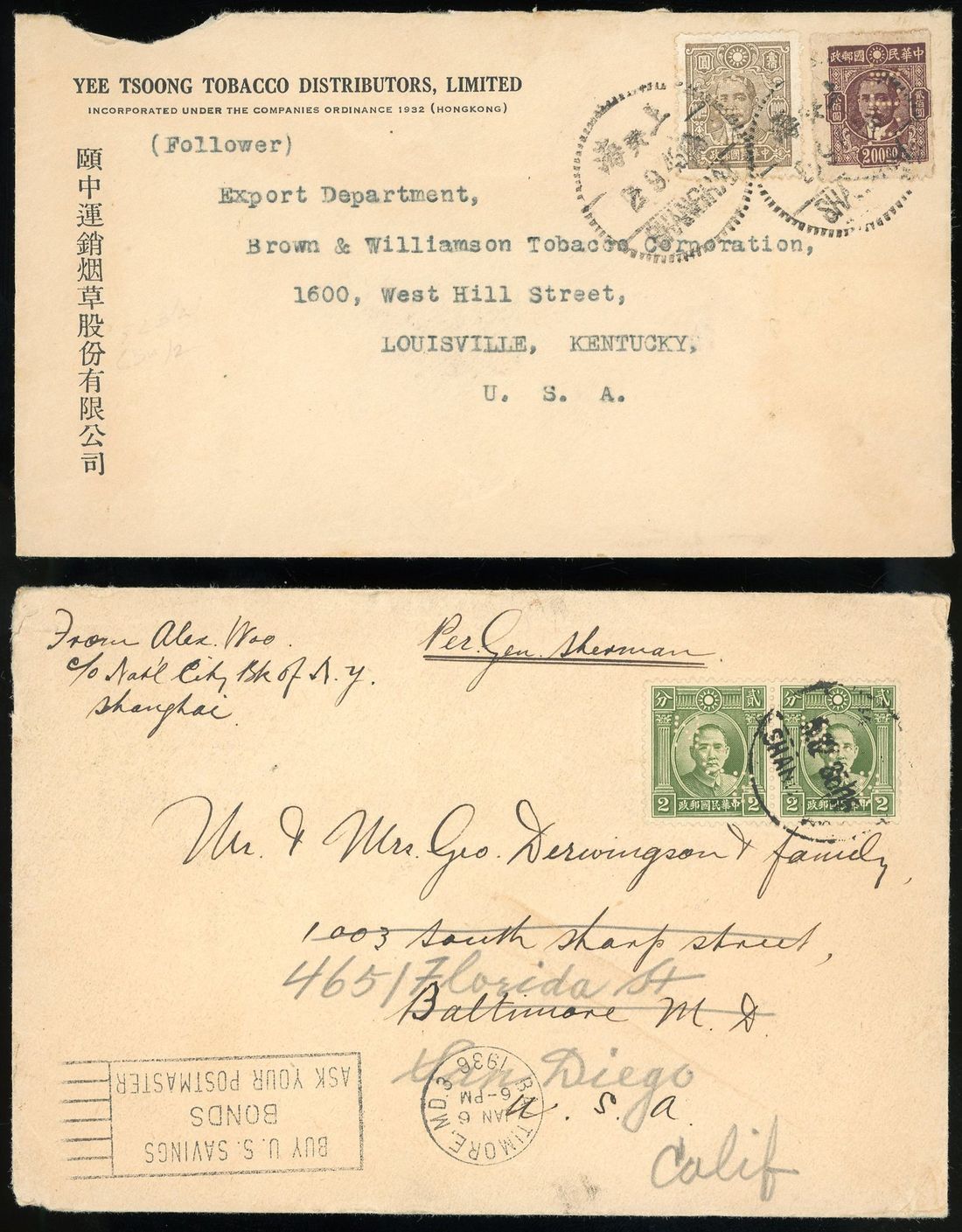 1936-46 Two envelopes from Shanghai to U.S.A and affixed with anti bandit stamps. Fine.