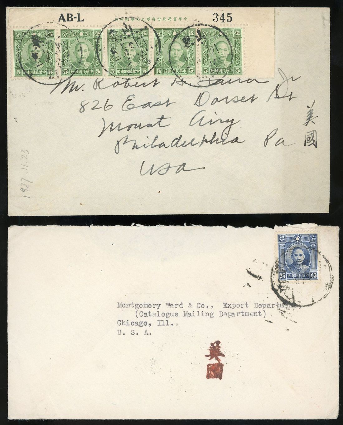 1937-39 two envelopes to U.S.A. one from Shantung another from Yunnan.Very fine.