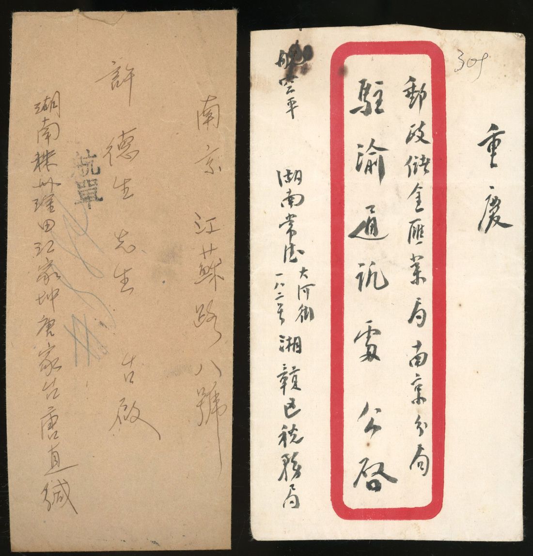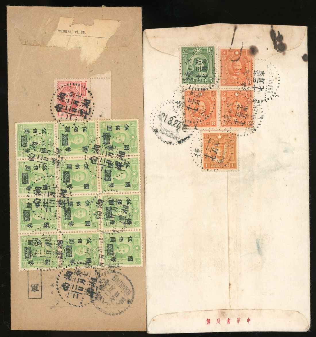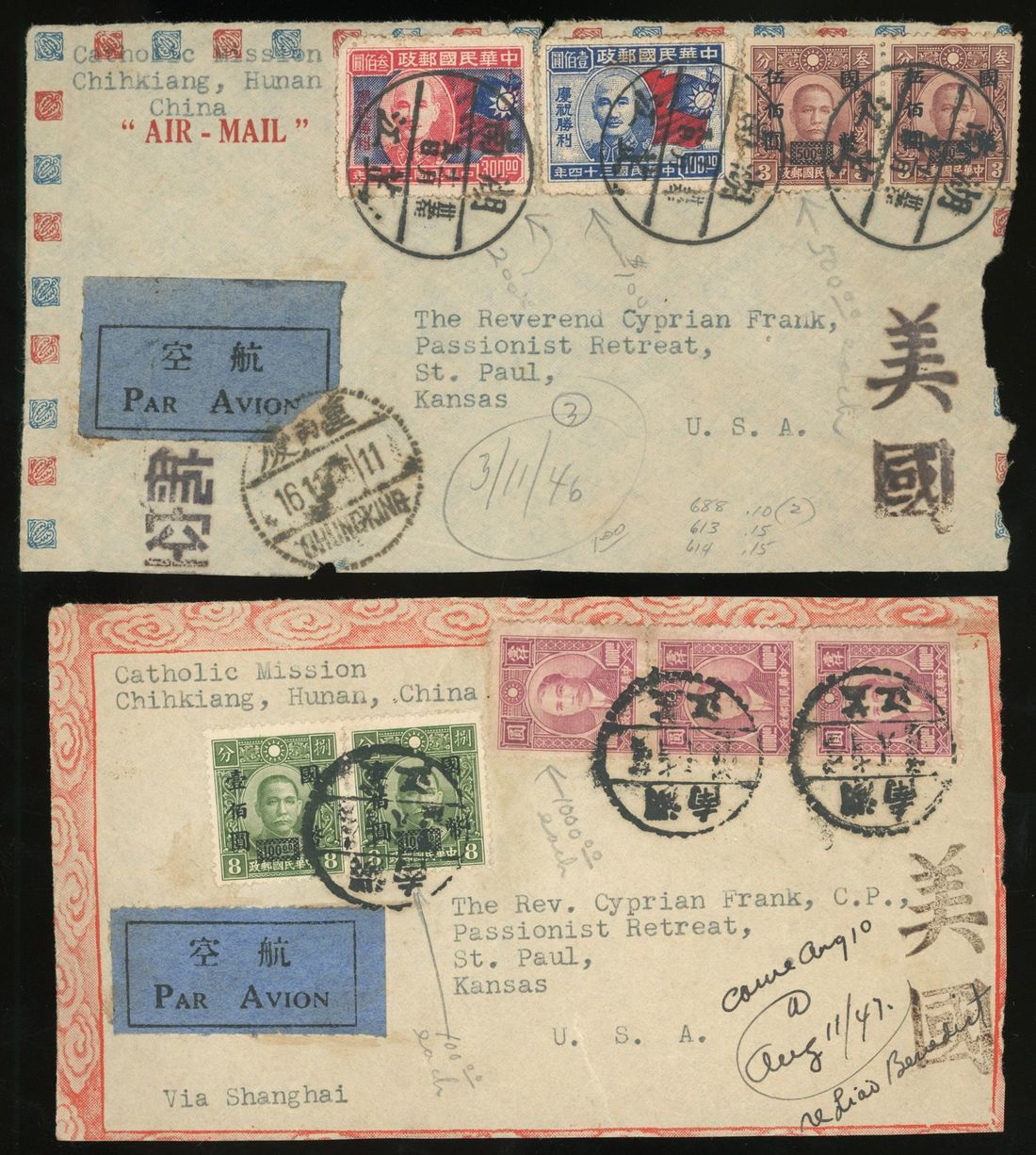 1938-48 two covers from Hunan sent to Chungking and Nanking.Also with two airmail coverfront to USA were sent from Hunan.Fine.