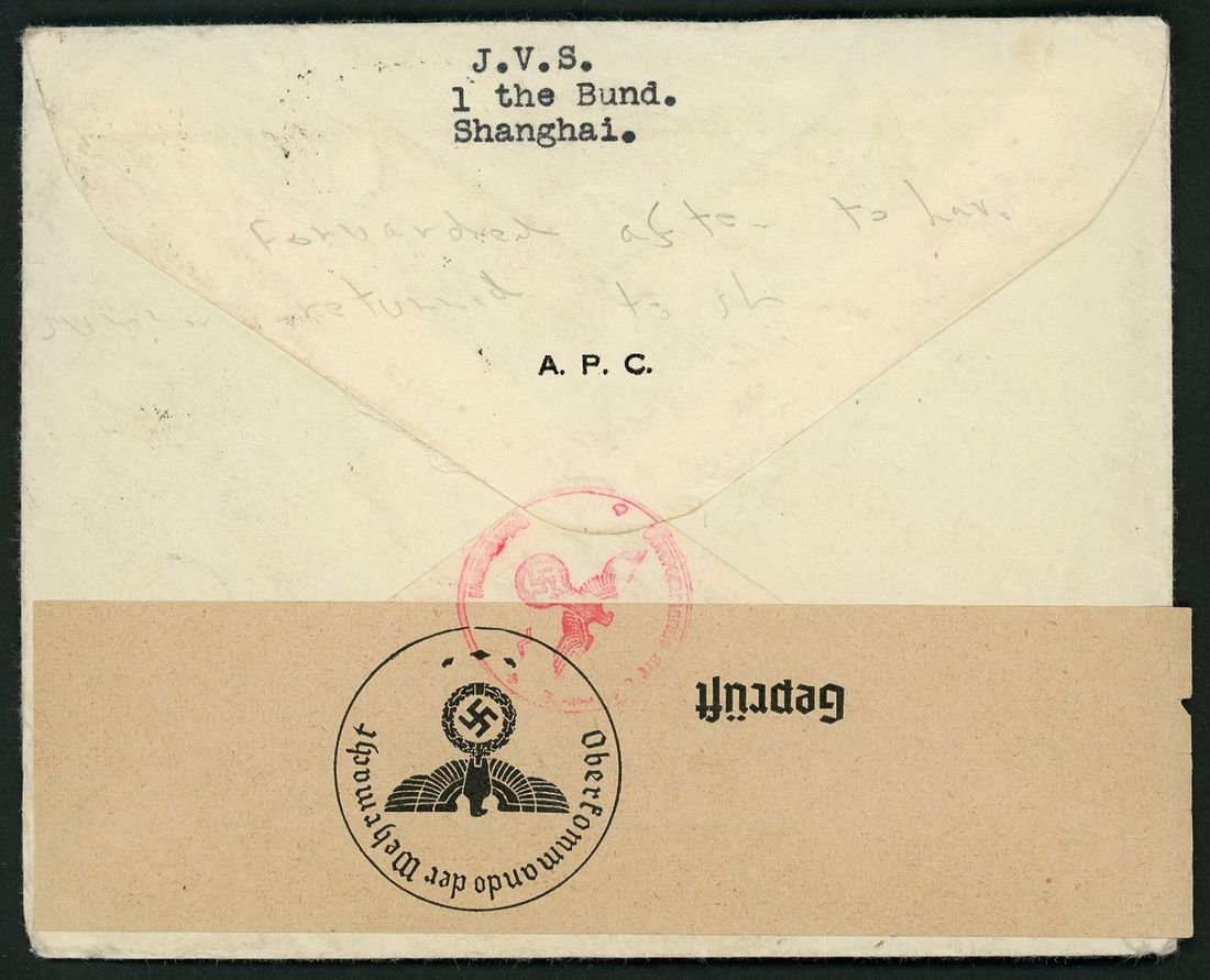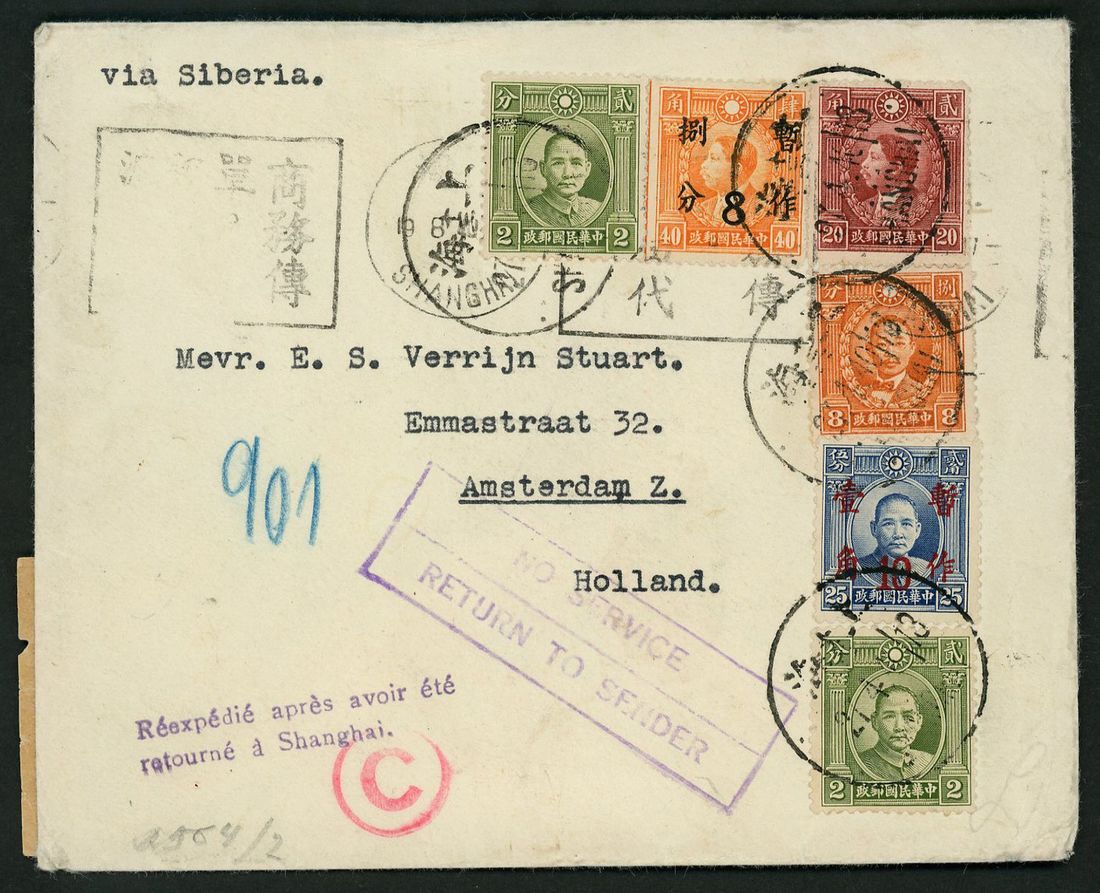 1940 (27 Apr) envelope to Holland bearing 2c x2, 8c,20c,8c on 40 and 10c on 25c. tied by Shanghai c.d.s. with German censor tape tied by censor cachet in red and 'No Service Return To Sender' in violet on face and returned '19 Aug 40 Shanghai'. Holland was occupied by the Germany May 10.Fine.