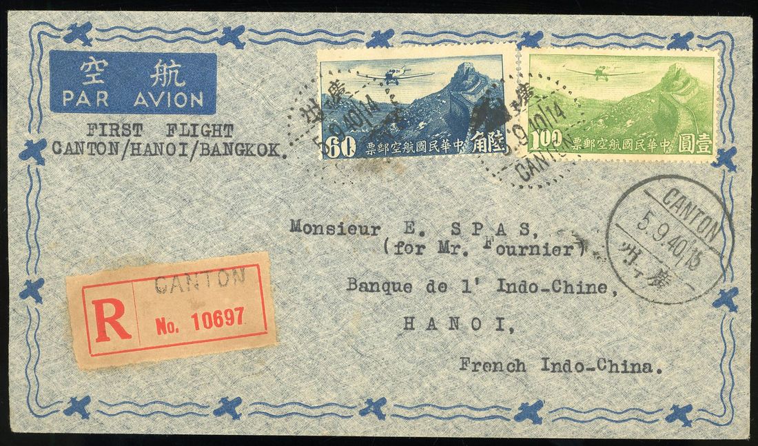 1940 (5 Sep) registered airmail envelope to Honai bearing 60c and $1 tied by 'Canton' c.d.s.with Hanoi arrival dated '7 Sep' on reverse. Fine
