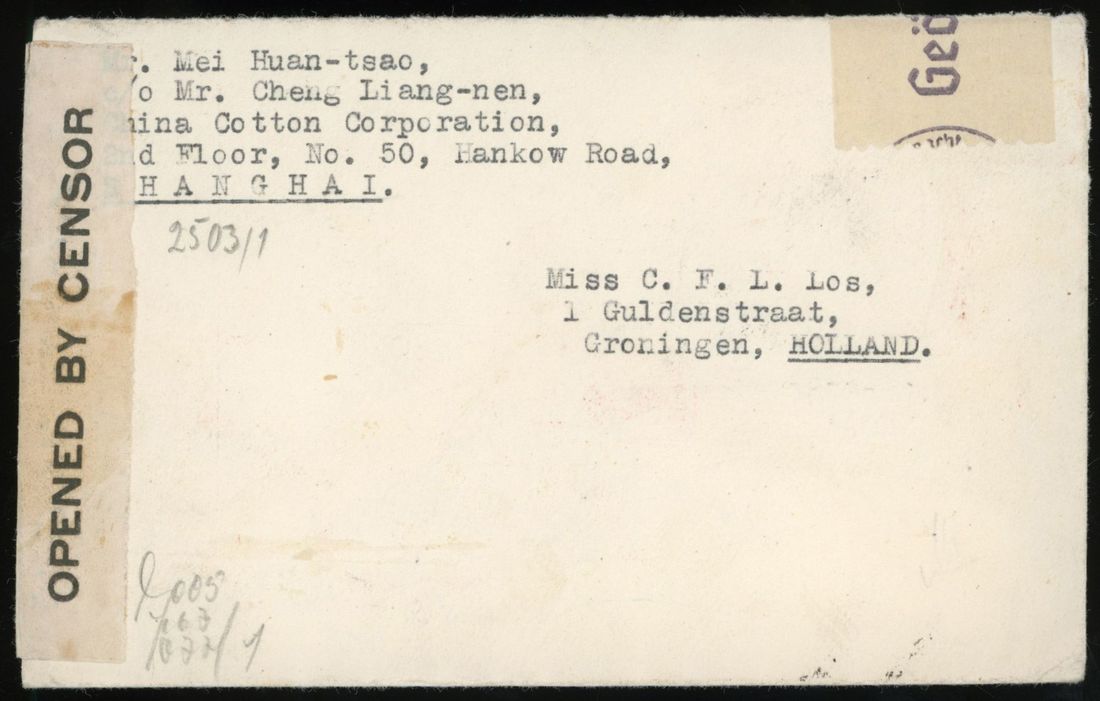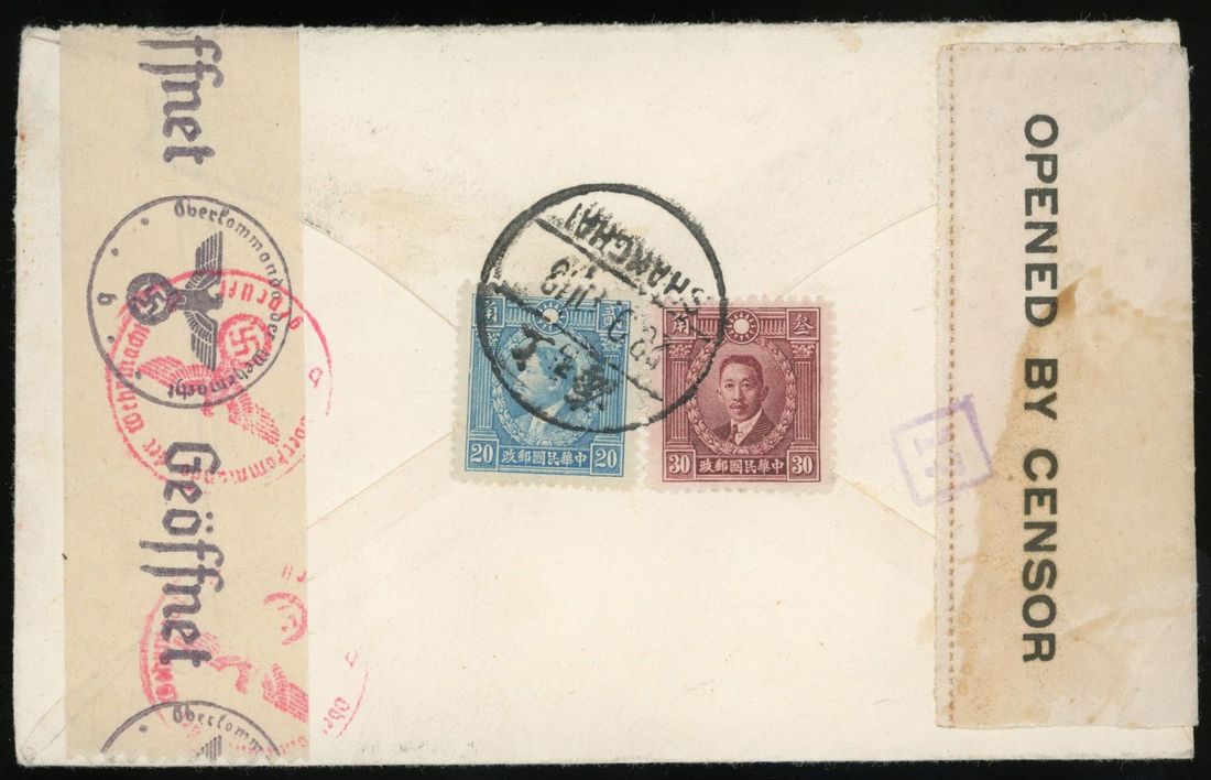 1941 (23 Sep) envelope to Holland bearing 20c and 30c tied by 'Shanghai' c.d.s. routed via Hong Kong with 'Opened by Censor' label tied by box '17' in violet with German censor label.Very attractive censored cover to Holland.