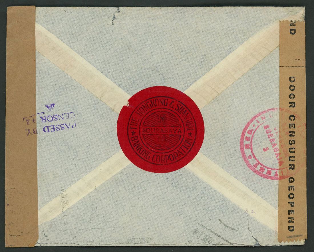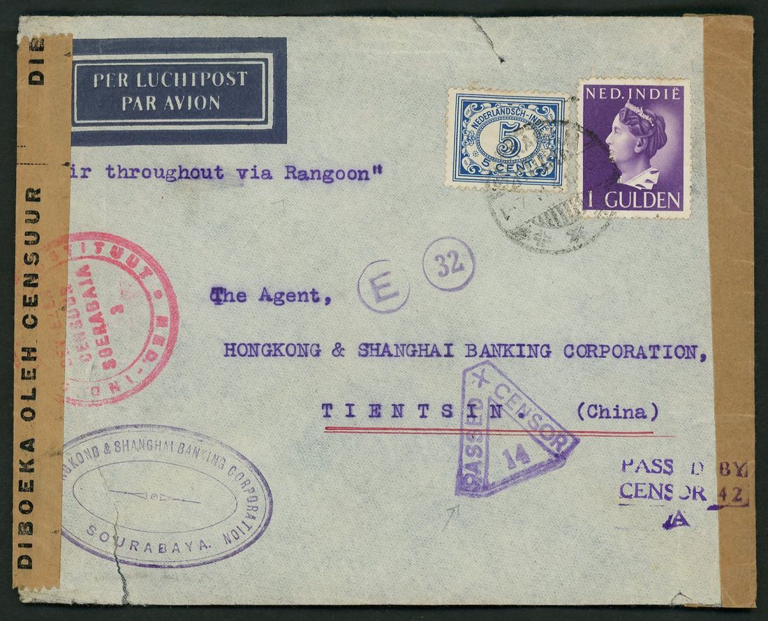 1941 air mail envelope written from 'The Hong Kong & Shanghai Banking Corporation/ Sourabaja' to Tientsin China bearing Ned. Indie 5c and 1g tied by Sourabaja date stamp.Carried by KNILM to Batavia and Singapore, by KLM to Bangkok and BOAC to Rangoon and CNAC to Tientsin.