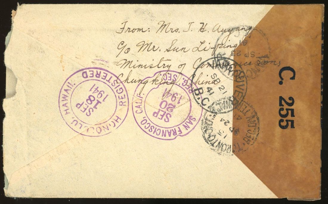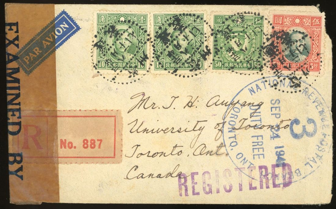 1941(30 Aug) air mail censor registered envelope to Toronto Canada bearing Dr. SYS 10c.(2) 50c. and $5 cancelled by "Tsunyi Kweichow" c.d.s. and with 'Honolulu,Hawaii''San Francisco''Vancouver' transists c.d.s and 'Toronto' arrival c.d.s on back. Fine.