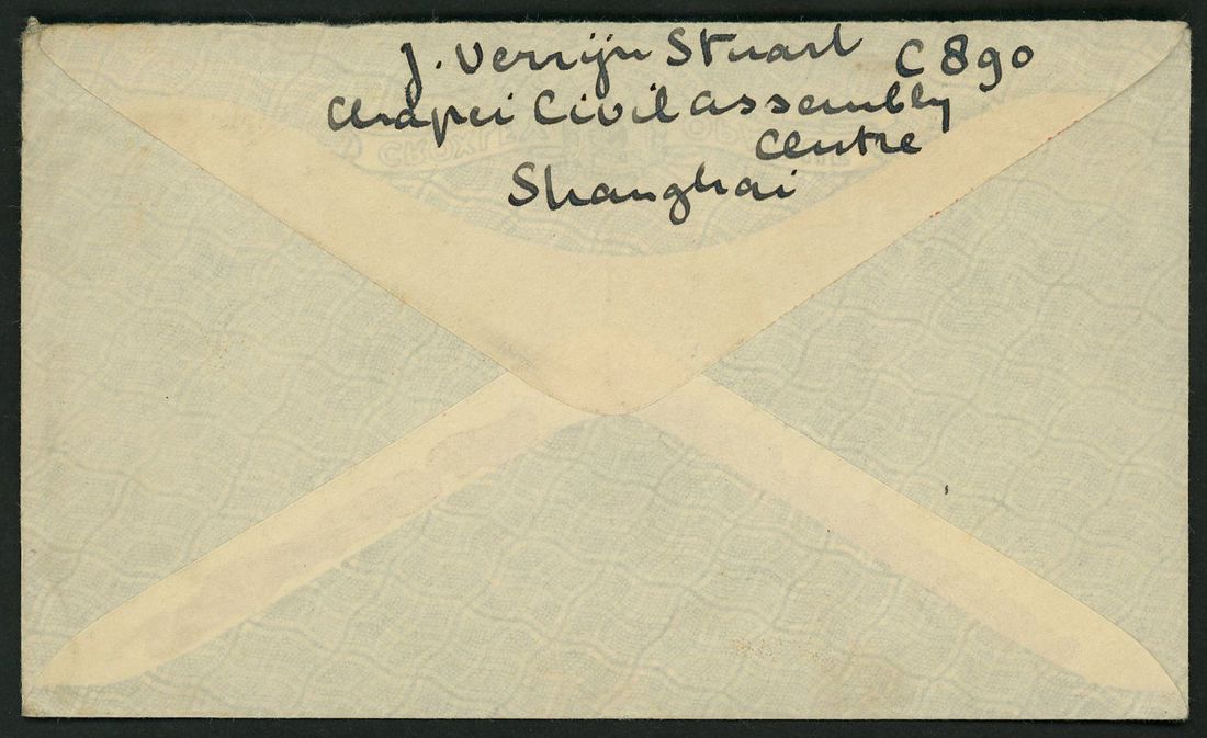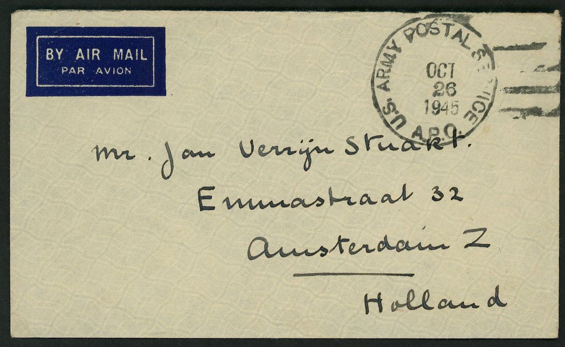 1945 stampless air mail envelope to Holland cancelled by 'U.S.Army Postal Service A.P.O. Oct 26 1945' c.d.s. very fine item from ex Dutch P.O.W.in Chapei Camp.