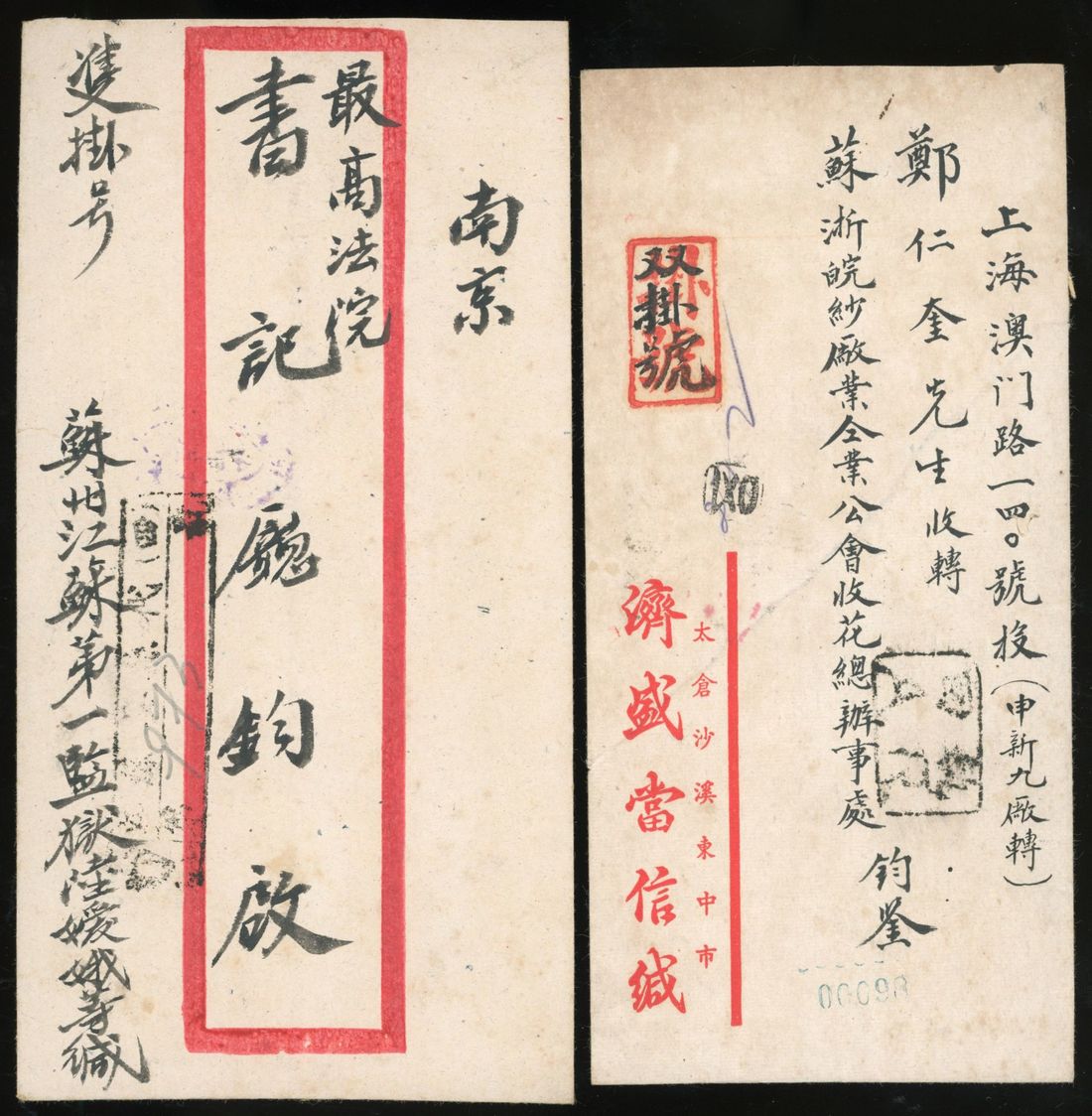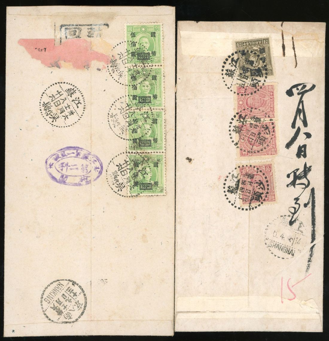 1945-47 two double registered envelopes to Shanghai and Nanking. Another cover to Hong Kong, all from Kiangsu.Fine.