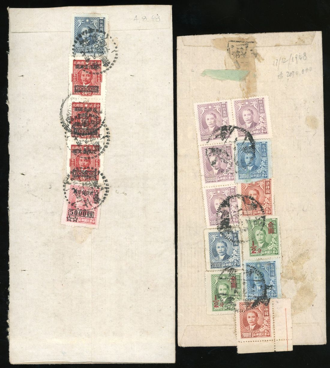 1948 (4 Aug) air mail envelope from "Linxia Kansu" to Kweiyang bearing Dr SYS $50000x1 and overprint $5000 x1,$10000x3,fine. Another cover from Kansu Ningting to Lanchow.Fine.