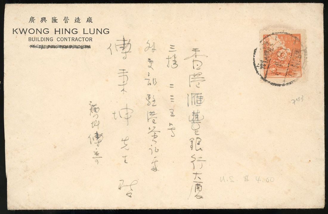 1949 (18 Aug) envelope to Hong Kong bearing domestic ordinary stamp tied by 'Canton' c.d.s. Fine.