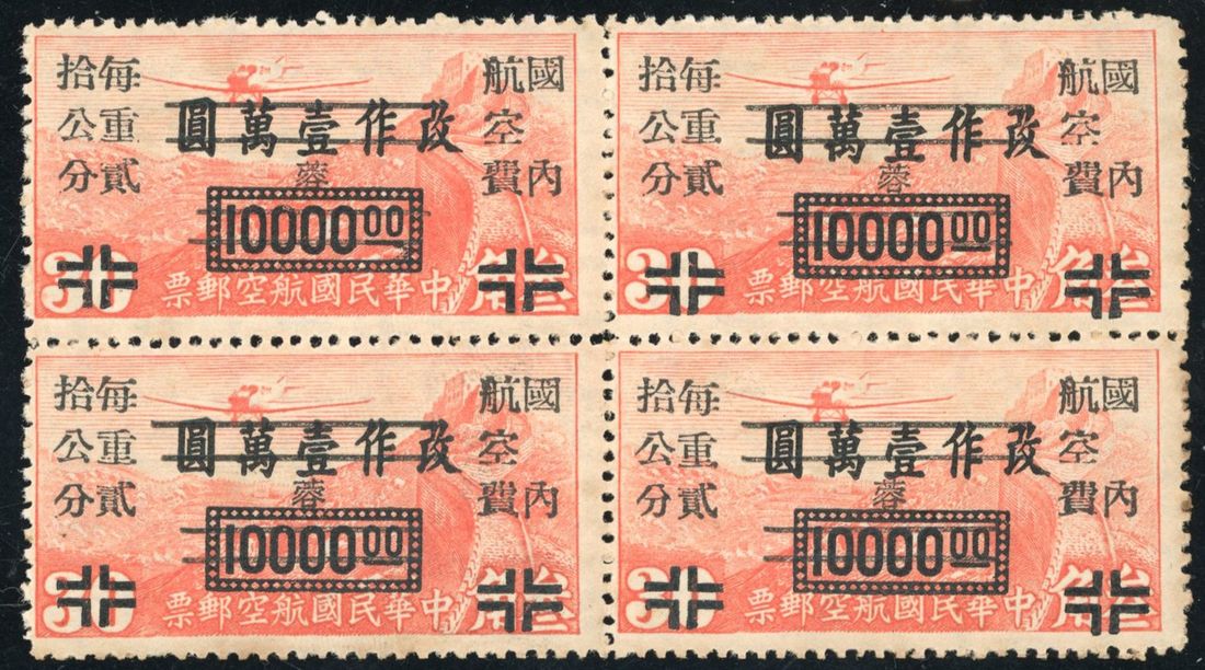 West Szechwan Airmail Unit Stamps overprint on $10,000 on 30c block of four mint never hinged. Chan SA3
