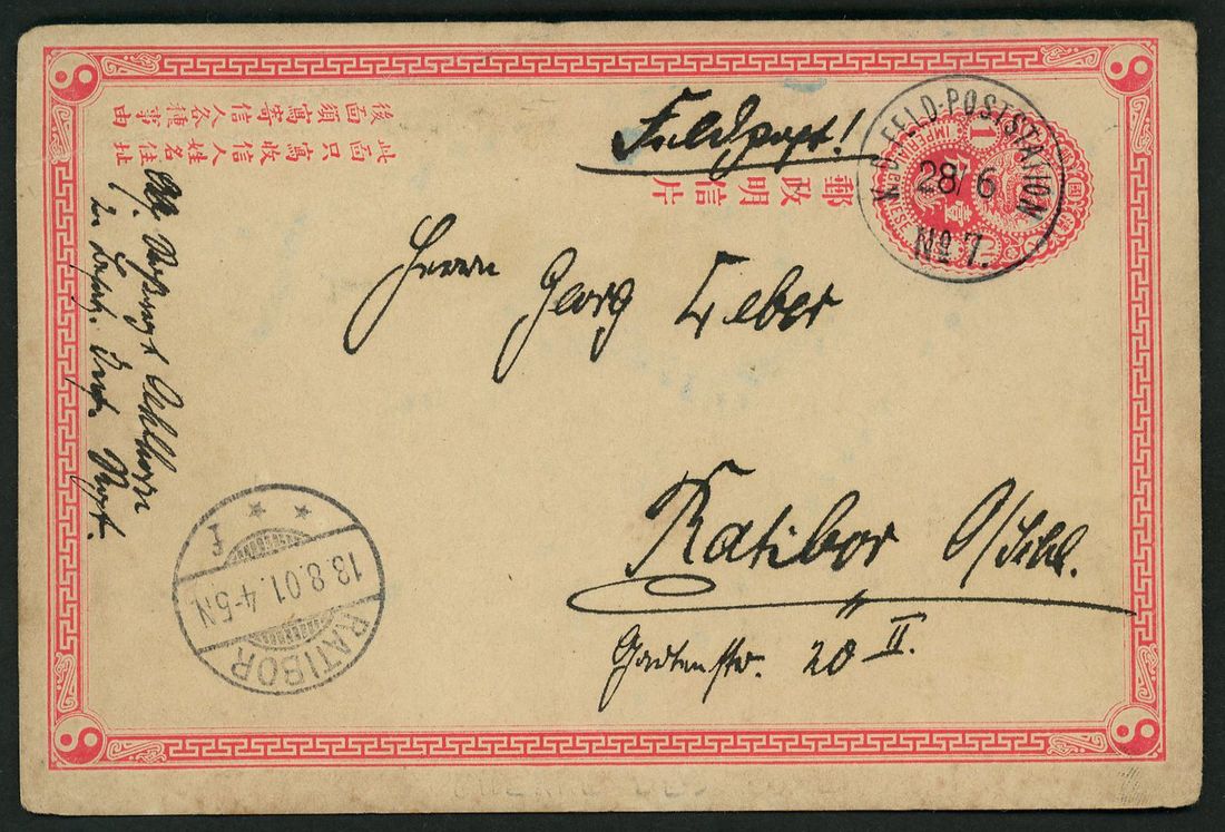 1901 1c card to Germany cancelled 'K.D.Feld-Poststation No7. 28/6' c.d.s.with Ratibor arrival 13/8/01 on face.